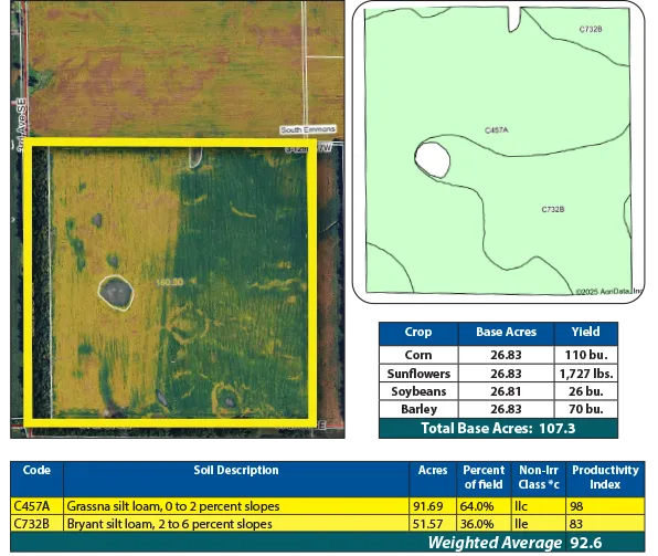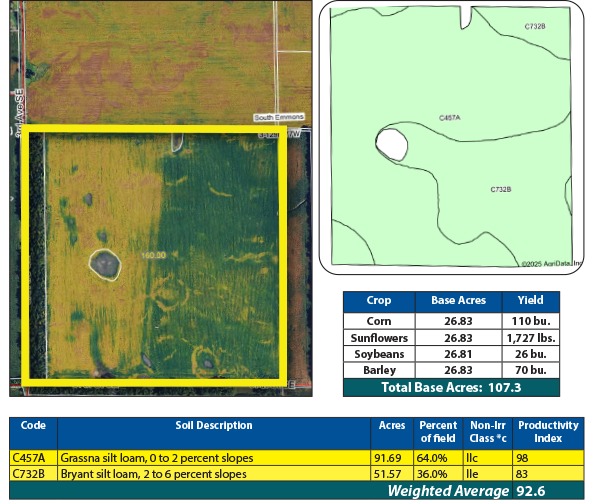 This highly productive parcel boasts an SPI of over 92, with soils largely comprised of Bryant and Temvik loams. The land features a mature shelterbelt and a consistent history of high yields.