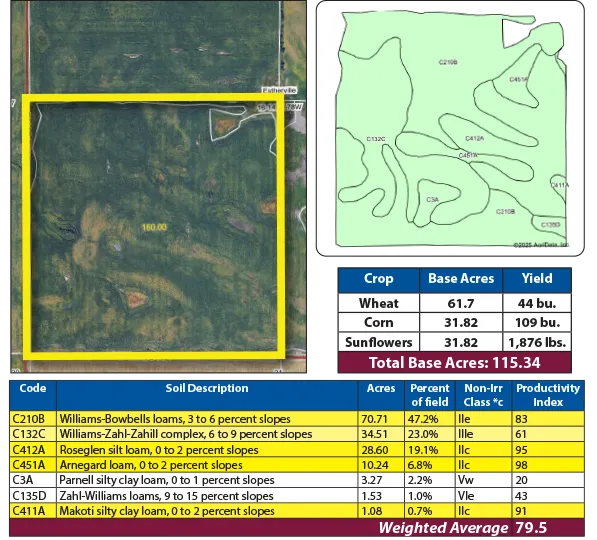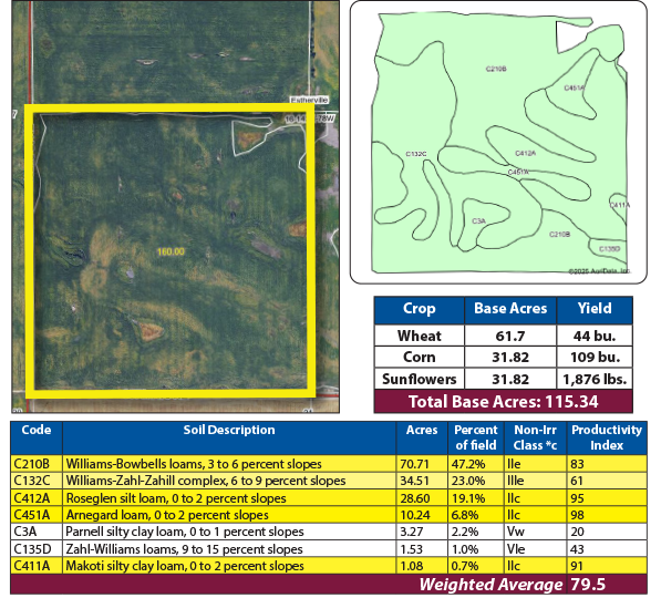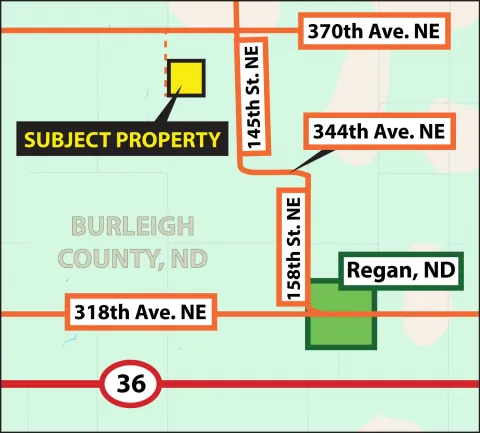 Pifer’s Auction & Realty is pleased to offer this quarter section of quality cropland in Burleigh County, ND. This highly productive farmland features 149.94 +/- crop acres, with mostly all class II and class III soils and boasts an average SPI (Soil Productivity Index) of 79.5! The property is situated just northwest of Regan, ND, in a highly regarded agricultural area known for its fertile soil and high-yielding crops. This is a must consideration for farmers and investors. This farmland has a lease in place for 2025; the buyer will receive the entire 2025 cash rent lease. The lease expires at the end of the 2025 crop year.