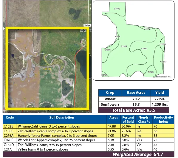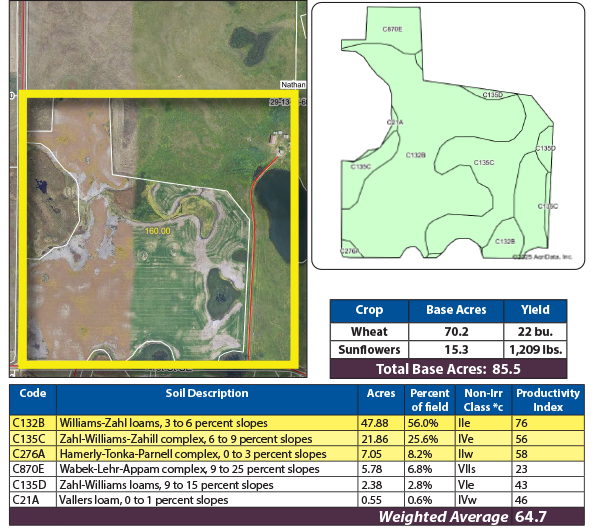 This Pifer's land auction features 160 +/- acres in Logan County, ND. The property features a mix of productive cropland and lush pasture as well as a home with multiple out buildings. The cropland has a soil productivity index (SPI) of 64.7 and contains soil types like Williams-Zahl loams and Zahl-Williams-Zahill complex soils. The pastureland has perimeter fencing and adequate water sources. The mix of cropland, pasture, and wetlands on the property create excellent wildlife habitat. This property is subject to US Fish and WIldlife easements. Don't miss this excellent opportunity to expand your farm operation or diversify your investment portfolio!