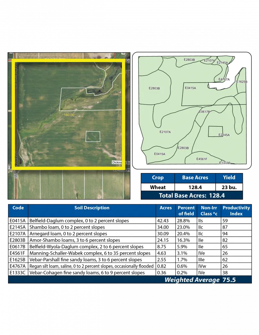This property features some of the most productive cropland in Western North Dakota! With a Soil Productivity Index (SPI) of 75.5, this quarter is suitable for growing wheat, sunflowers, corn, canola and peas. This parcel also offers great access only 4 miles from Lefor, ND. This property is leased for the 2026 crop season, and the buyer will receive the lease payment.