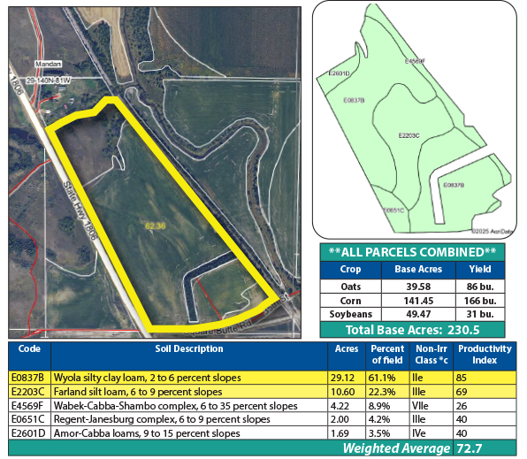 This is a rare opportunity to purchase a highly diverse and productive property just five miles north of Mandan, ND, along Hwy. #1806. Offered in three distinct parcels, this land presents strong potential for both agricultural and development uses. The cropland is highly productive, featuring irrigated acres primarily consisting of Lohler Complex soils, boasting Soil Productivity Indexes (SPI) over 76 — ideal for a wide variety of crops. The property also benefits from excellent logistical advantages, including BNSF Railway frontage and excellent access via 35th St. Parcel 3 stands out as prime development land with direct access off Hwy. #1806, making it an exceptional investment for residential properties. Whether you’re looking to expand your farming operation or capitalize on a high-potential development opportunity, this property deserves your attention.
