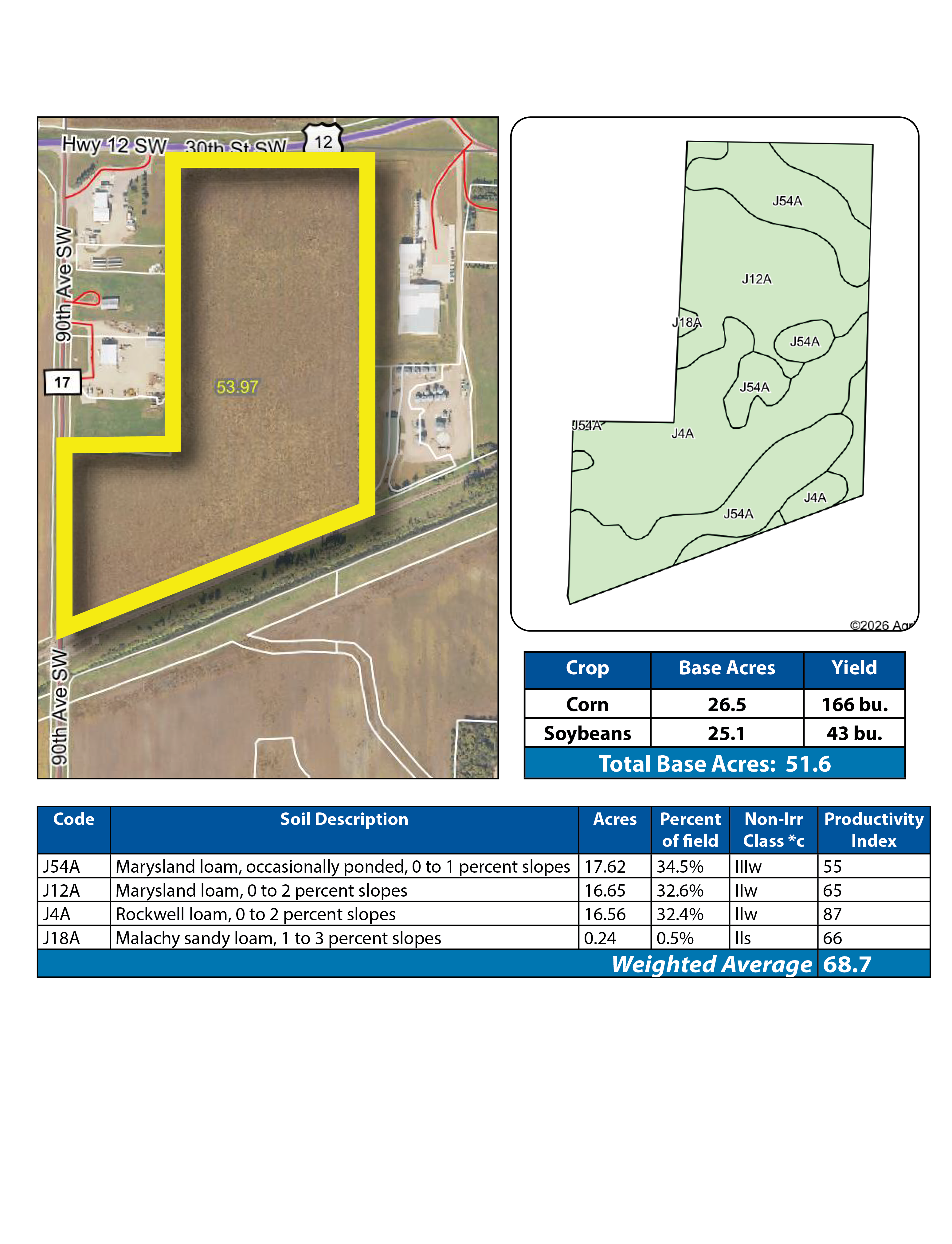 This is an excellent opportunity to purchase productive farmland located just outside of Danvers, MN, with Hwy. #12, County Rd. #17 frontage and RR frontage. This 53.97 +/- acre property features 51.62 +/- FSA crop acres and carries a Soil Productivity Index (SPI) of 68.7. The property is subject to an existing lease for the 2026 crop year with the buyer having full discretion to either continue leasing the property or farm it themselves beginning in 2027. The cropland consists primarily of productive Marysland and Rockwell loam soils making it a quality addition to any farming operation or land investment portfolio.