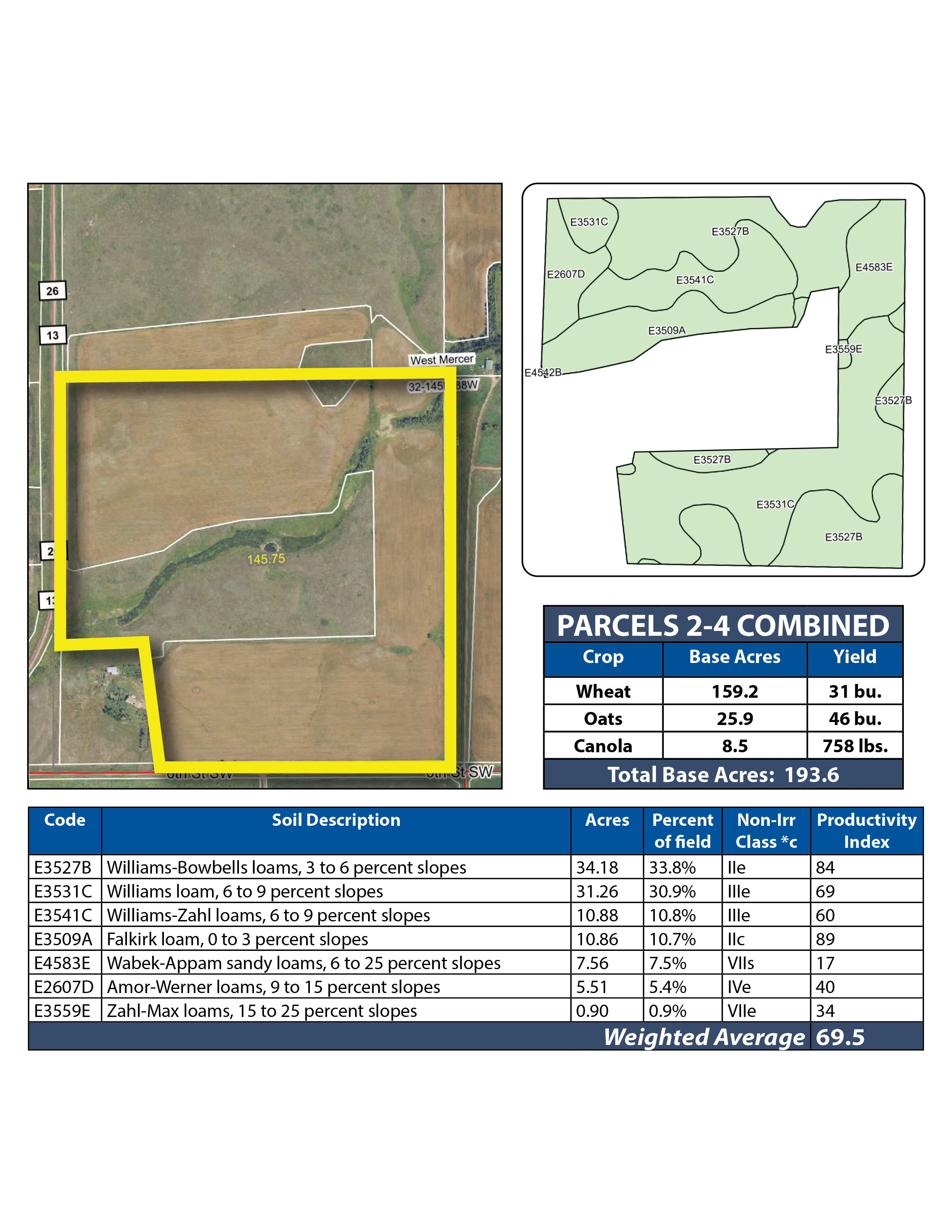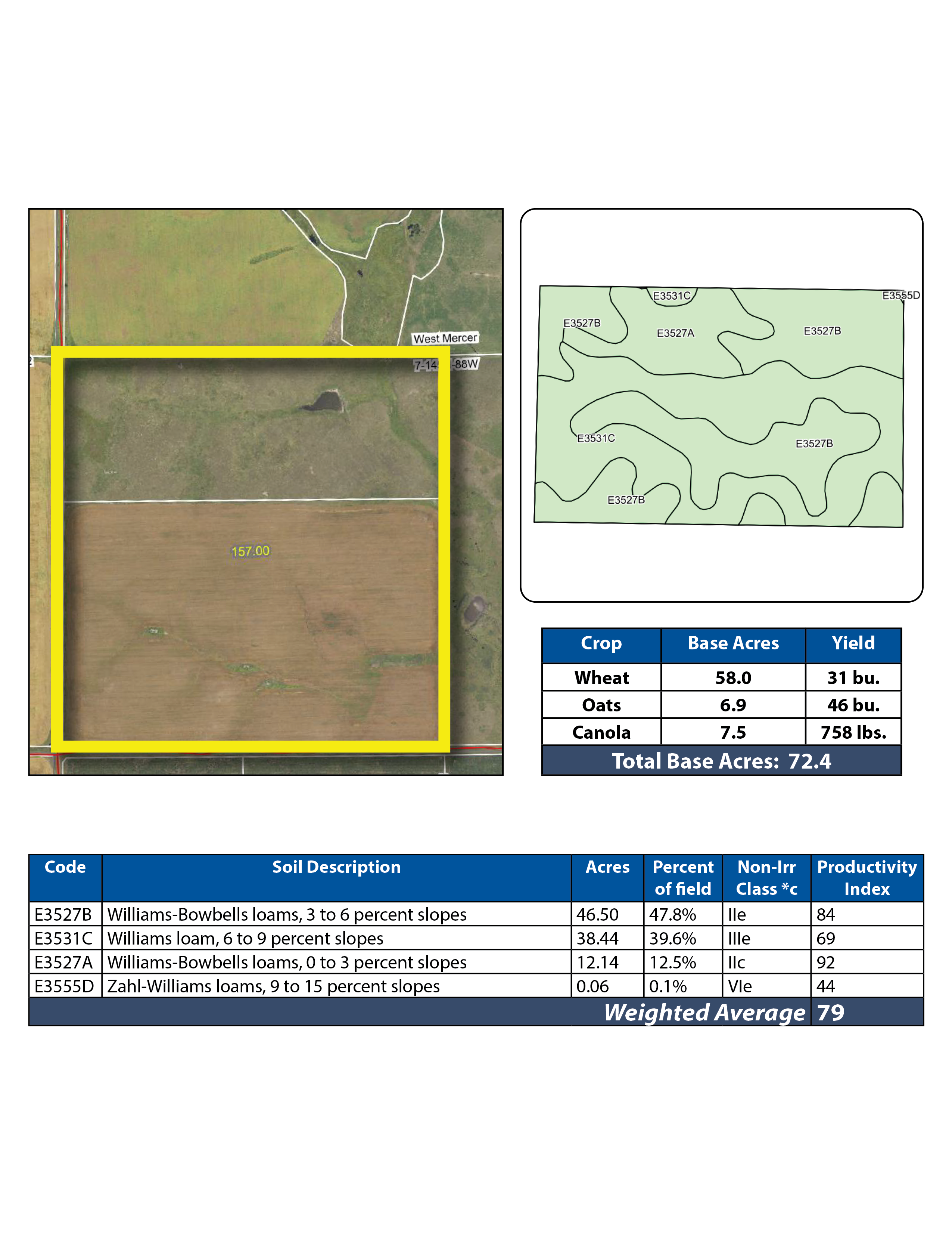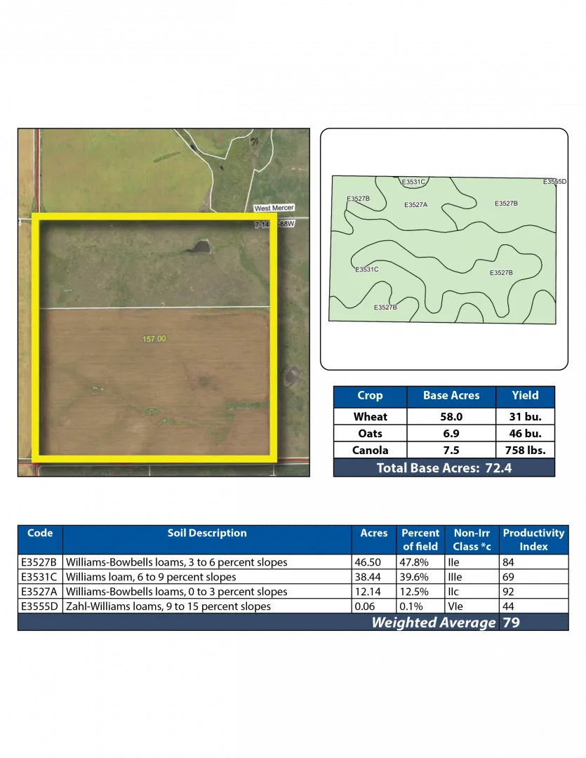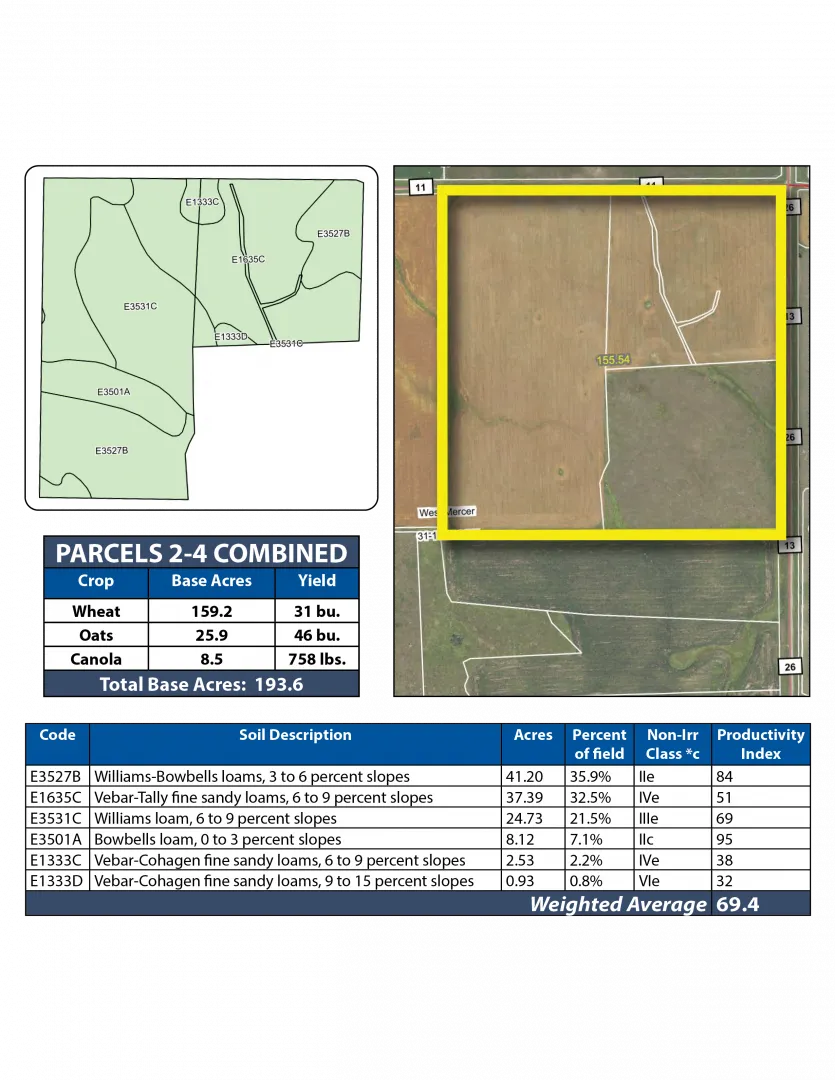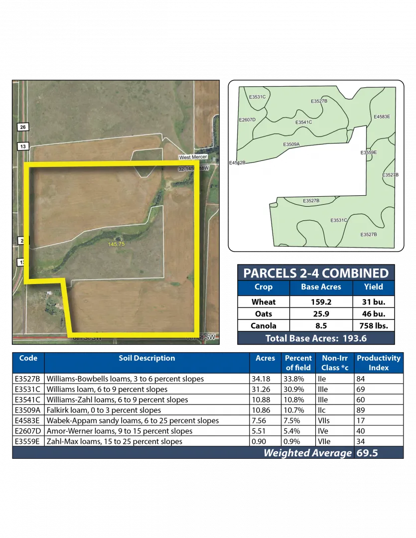 Parcel 1 boasts 97.14 +/- acres of productive cropland with an SPI of 79! The balance of the property consists of lush grasses and a water dugout for livestock.