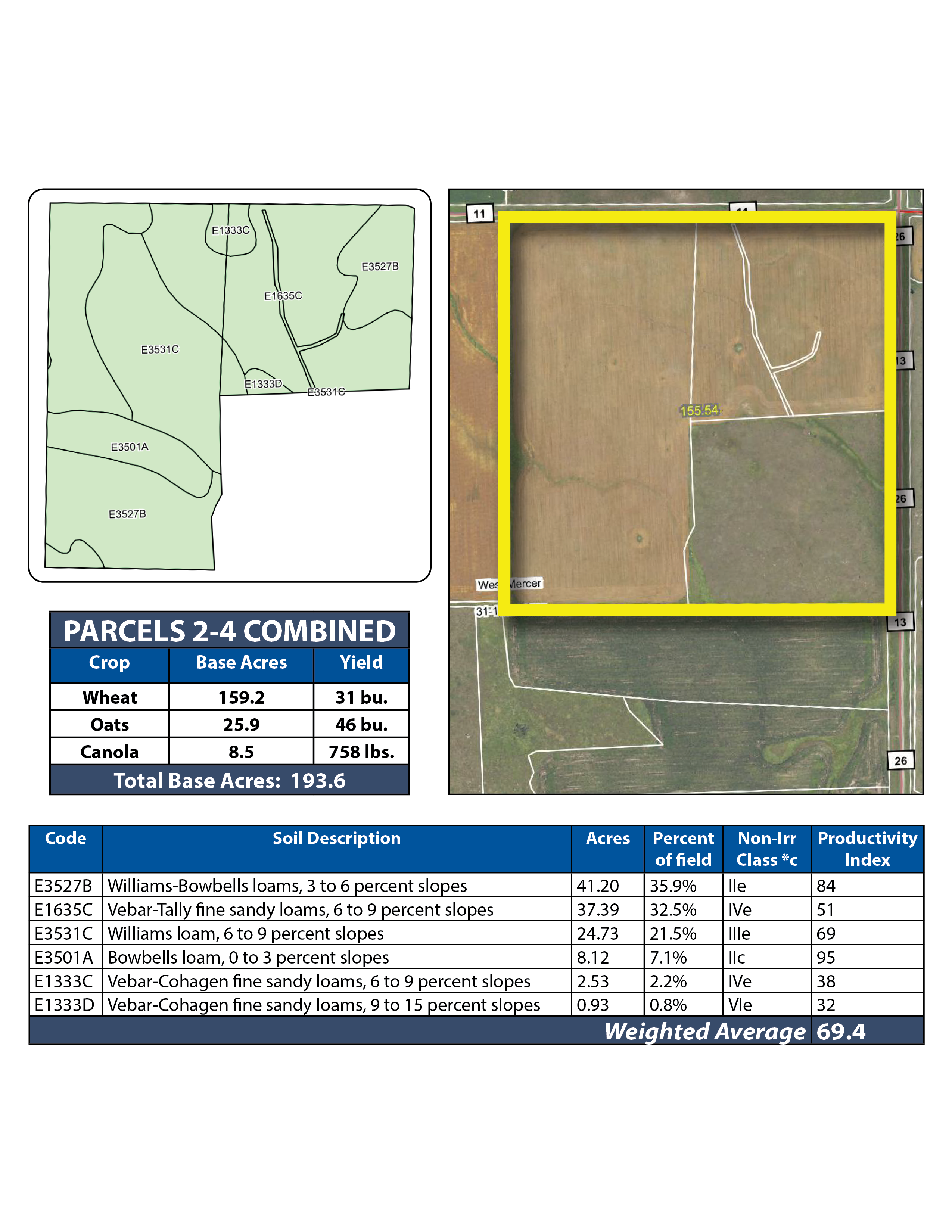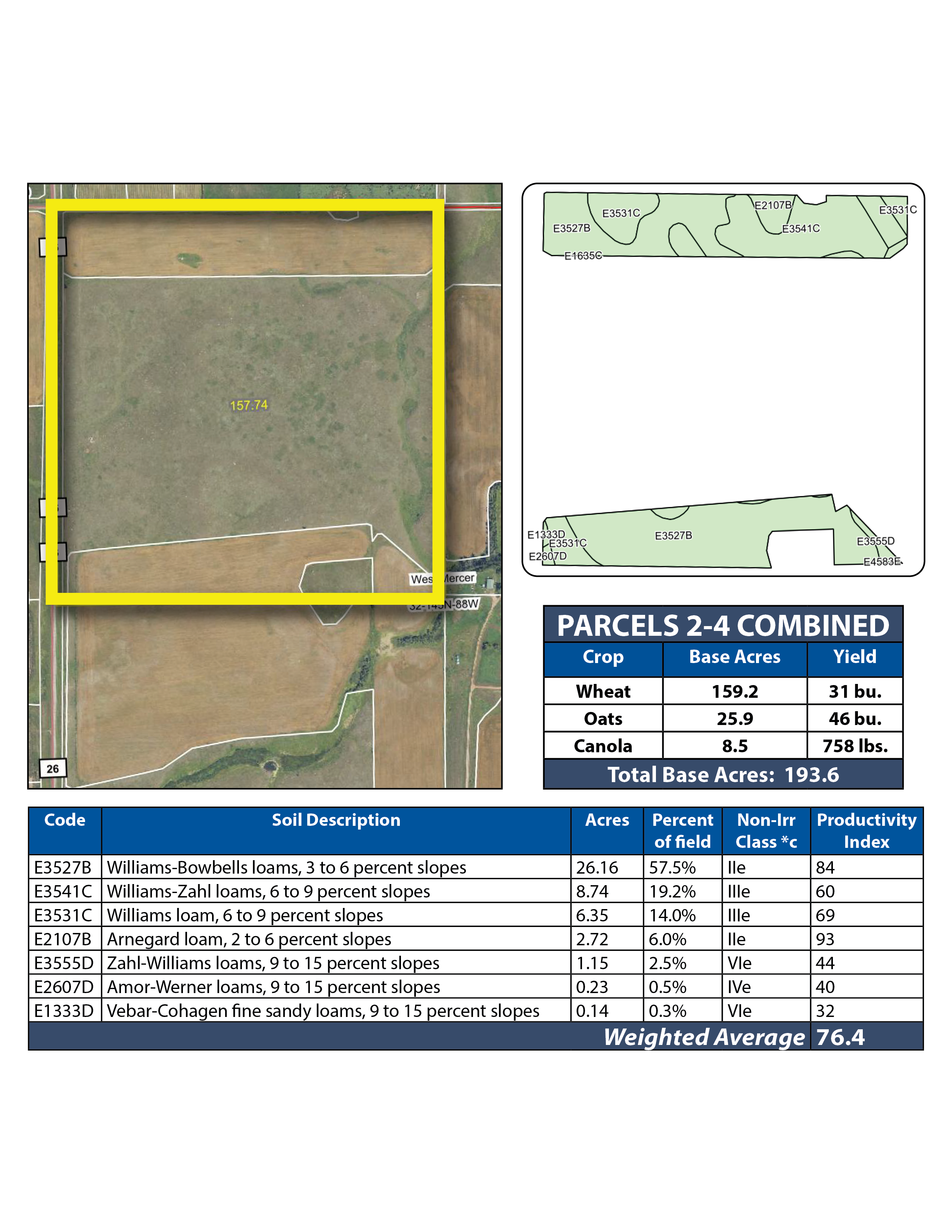 Parcel 3 consists of 45.49 +/- acres of cropland made up of mostly all Class II and III soils and has an SPI of 76.4! The 105.46 +/- acres of pasture supports plenty of grass, very well-maintained fencing, an electric power-fed well, and excellent access off County Rd. #13!