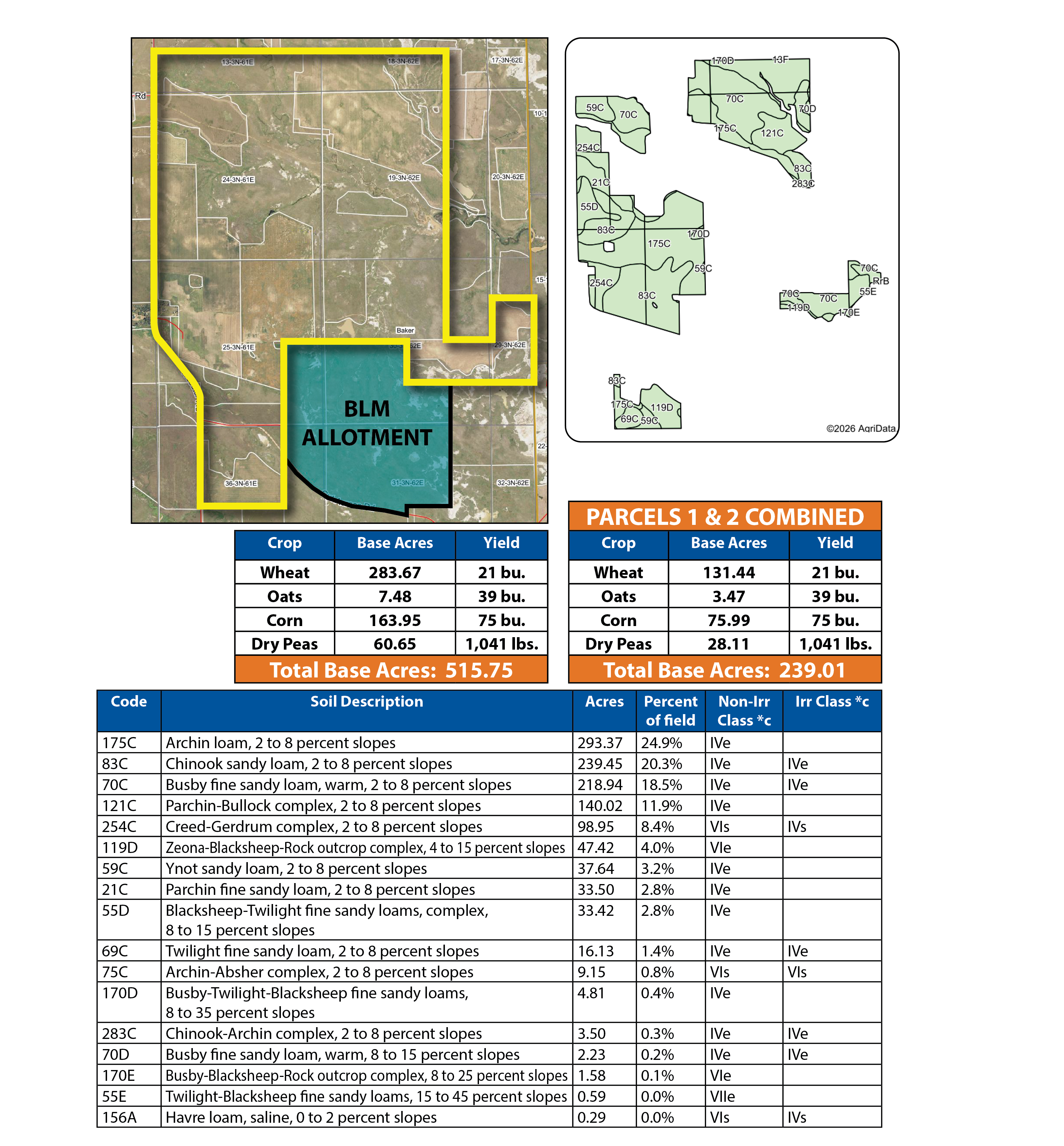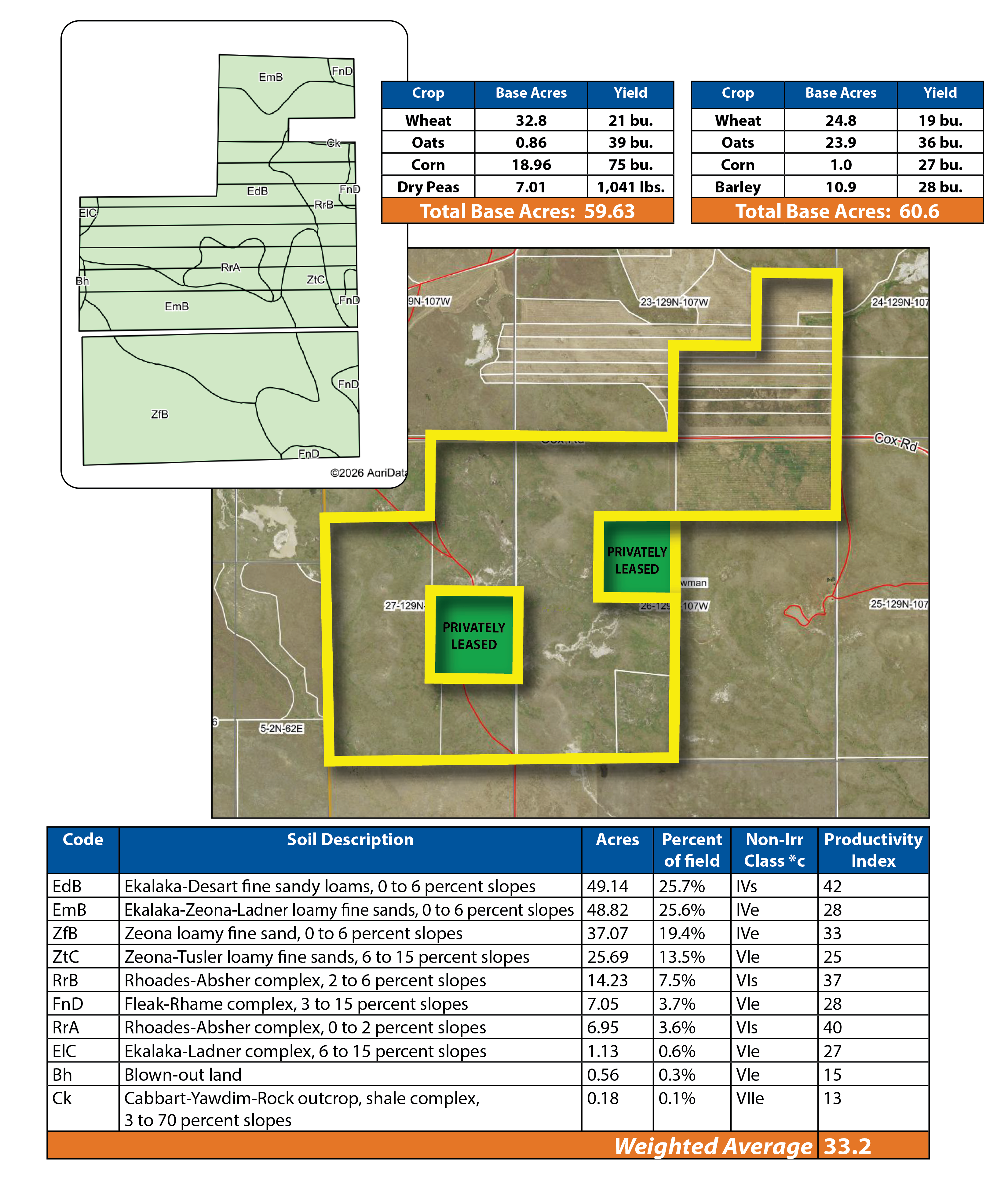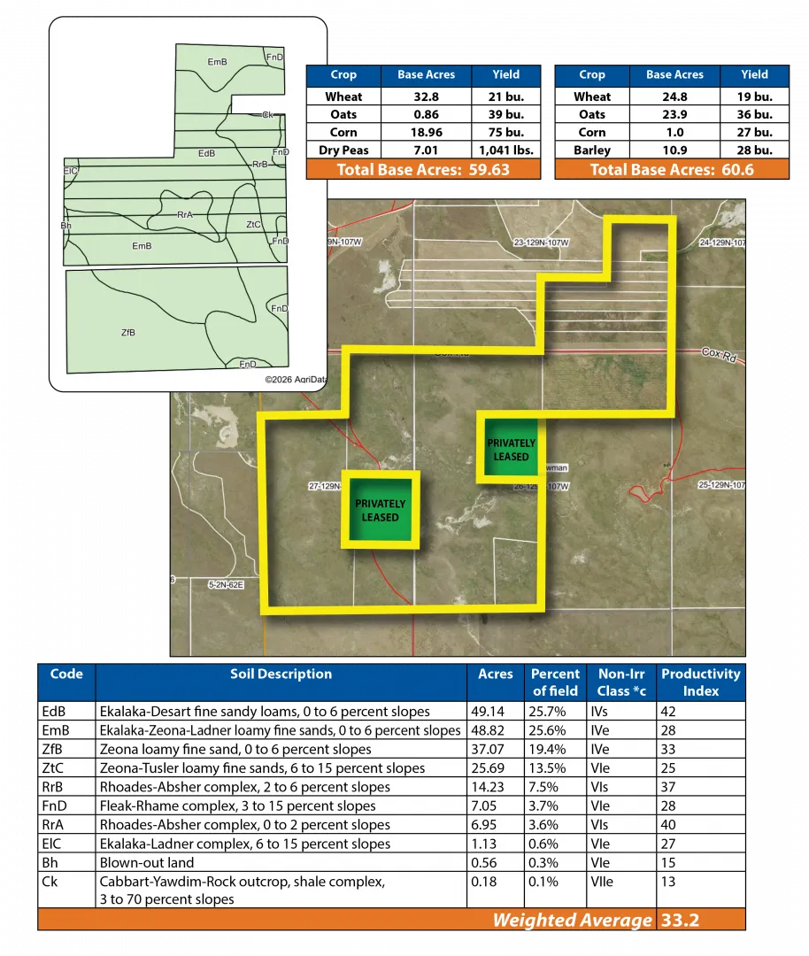 Parcel 3 offers a balanced mix of hay and pastureland with excellent access. The nearly 200 +/- acres of cropland are ideal for hay and feed production, while the native range supports consistent summer grazing. Access from Cox Rd. makes it a convenient and manageable grazing unit within the larger operation.