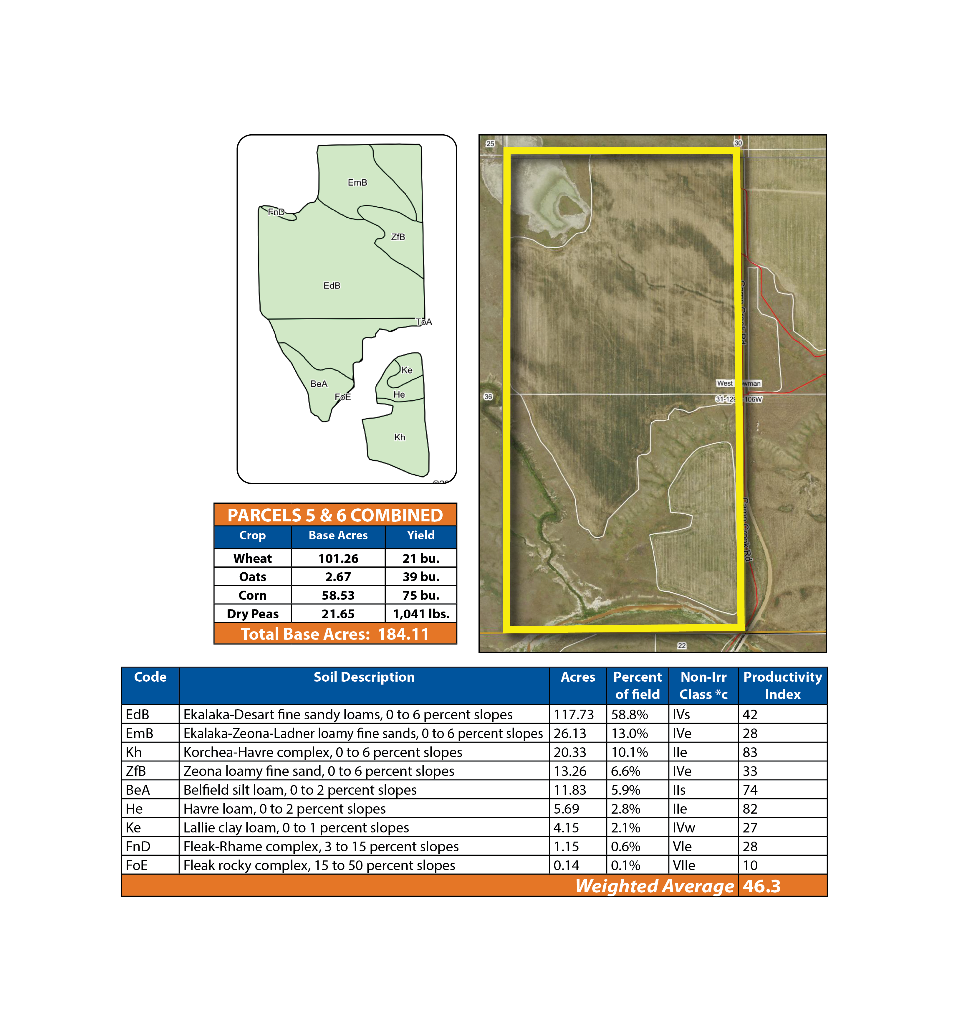 Parcel 5 is primarily cropland with productive soil profiles suitable for small grains and livestock feedstuffs. Its terrain transitions into the scenic Boxelder Creek basin, providing habitat and natural beauty along the southern boundary. This combination of fertile cropland and wildlife corridor makes it a desirable tract for crop production, hunting and recreation.