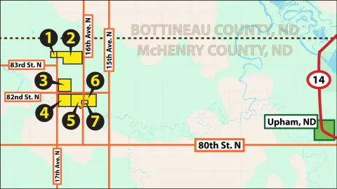 Parcels 3 - 7: From Upham, ND, go 9 miles west on 80th St. N to 16th Ave. N. Go 1.5 miles north on 16th Ave. N to parcels 5, 6, and 7. Continue a half mile north on 16th Ave. N to 82nd St. N. Go a half mile west on 82nd St. N to parcels 3 and 4.