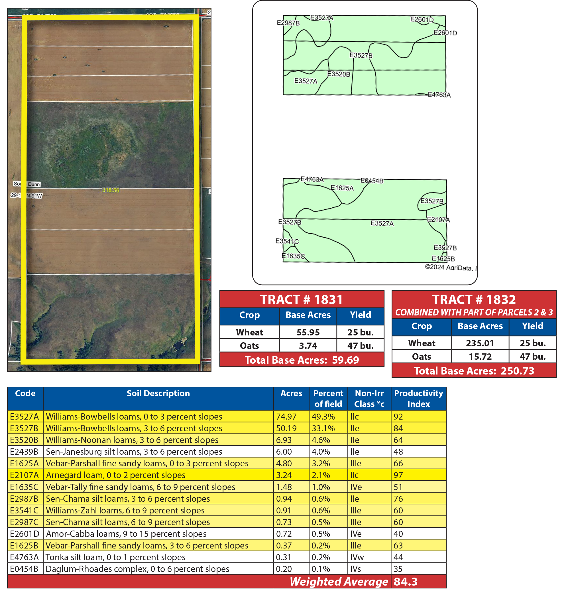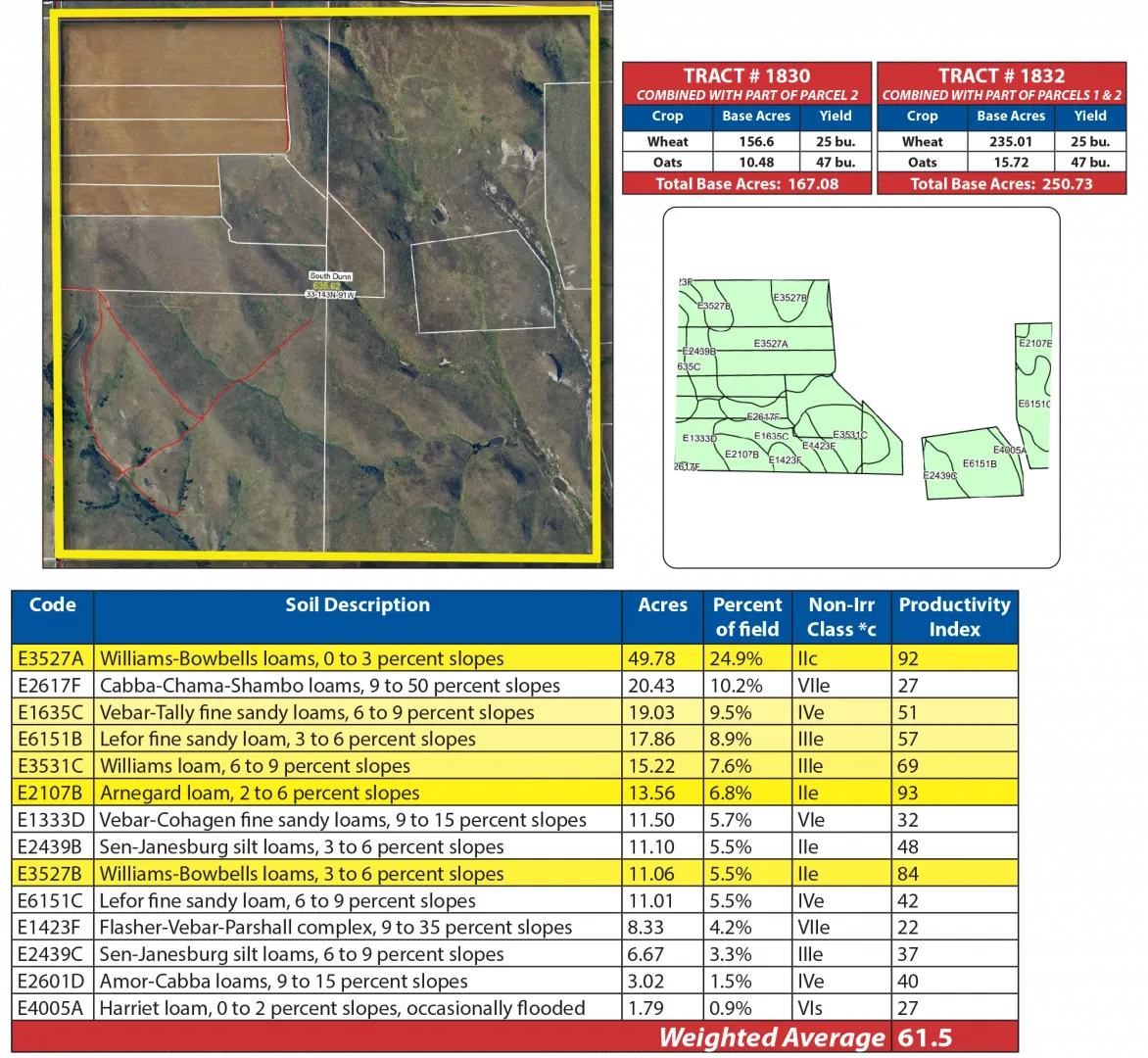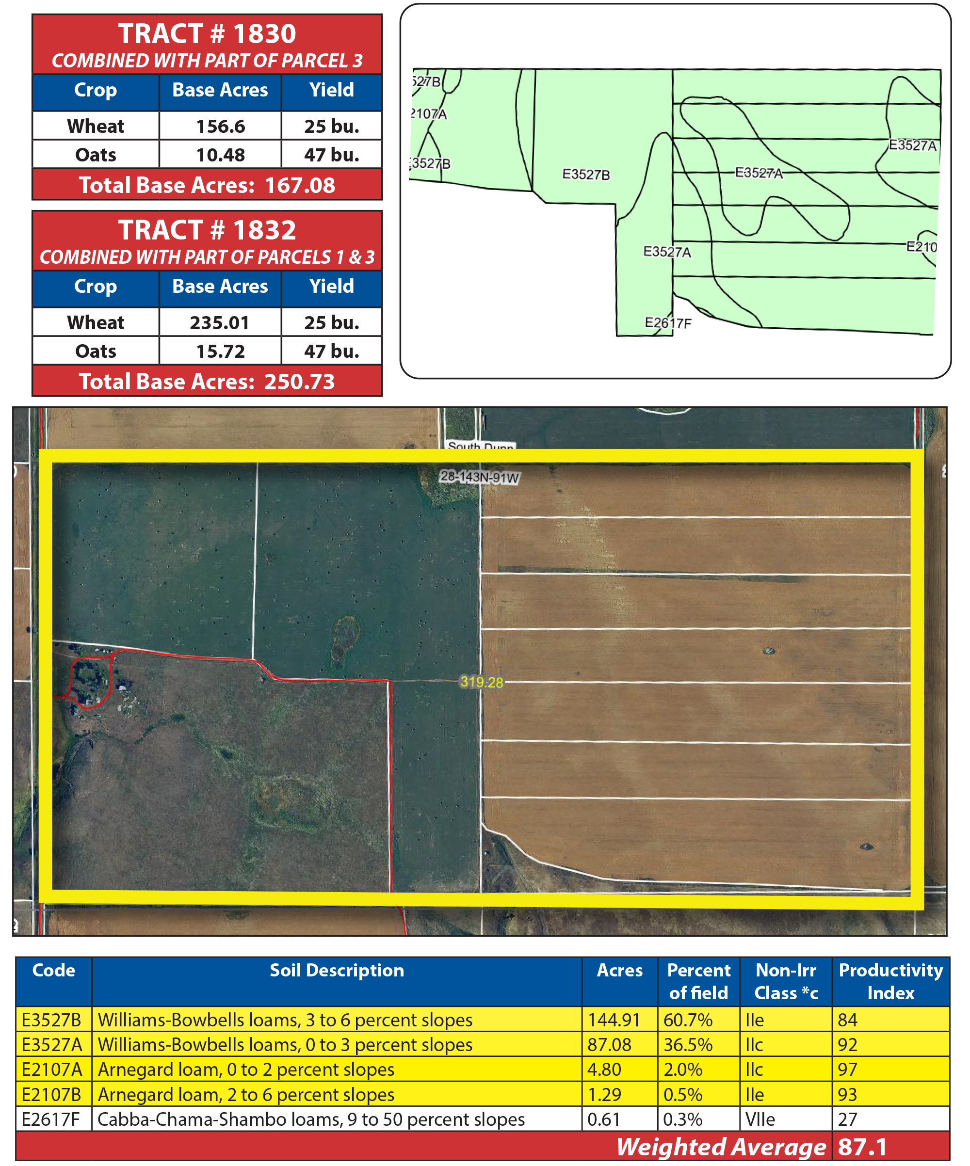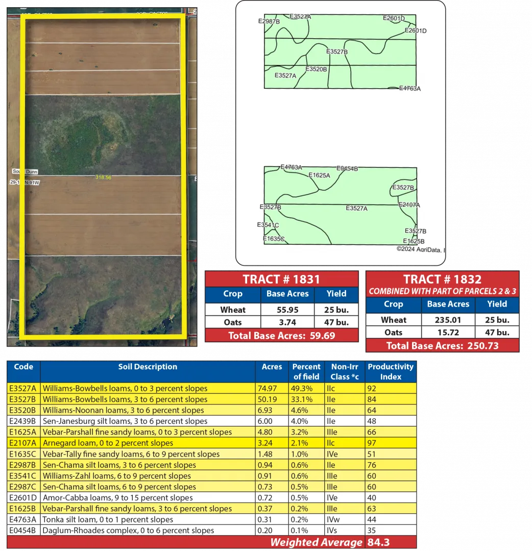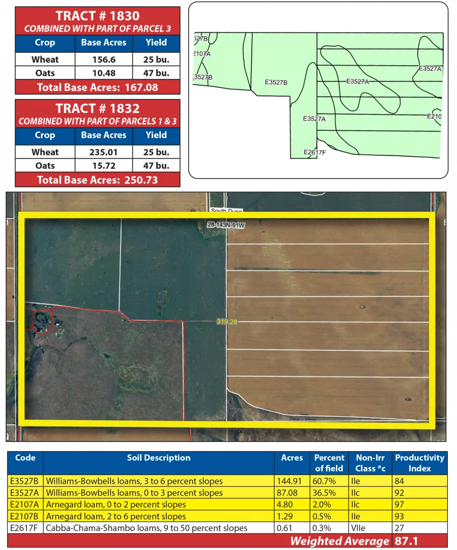 Parcel 2 is a highly desirable half section with over 74% contiguous acres of cropland. The fertile soils are dominated by Class II Williams-Bowbells and Arnegard profiles, boasting an impressive SPI of over 87. The balance of this parcel includes the original farmstead that includes a 60 +/- acre grazing pasture.