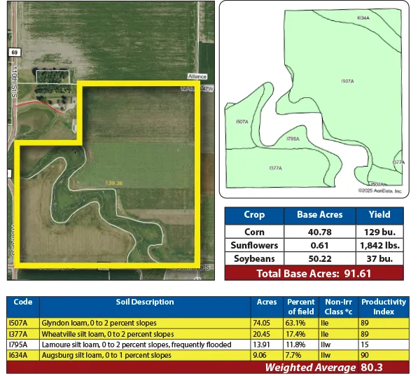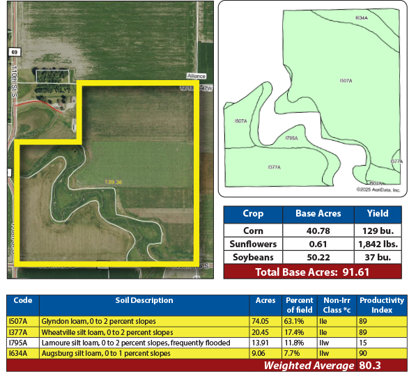 Pifer’s Auction & Realty is honored to present 139.36 +/- acres of farmland in Alliance Township. This high-quality property features 117.47 +/- FSA cropland acres and a strong Soil Productivity Index (SPI) of 80.3, with predominant Class II Glyndon and Wheatville loam soils. Currently planted to newly established alfalfa, this farm is ideally suited for hay production or future rotational cropping. The land sells with immediate possession, providing a timely opportunity for 2025 farming operations. Conveniently located near Sabin & Barnesville, MN, this farm is accessible by township-maintained roads.