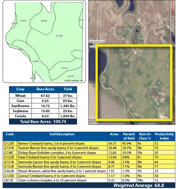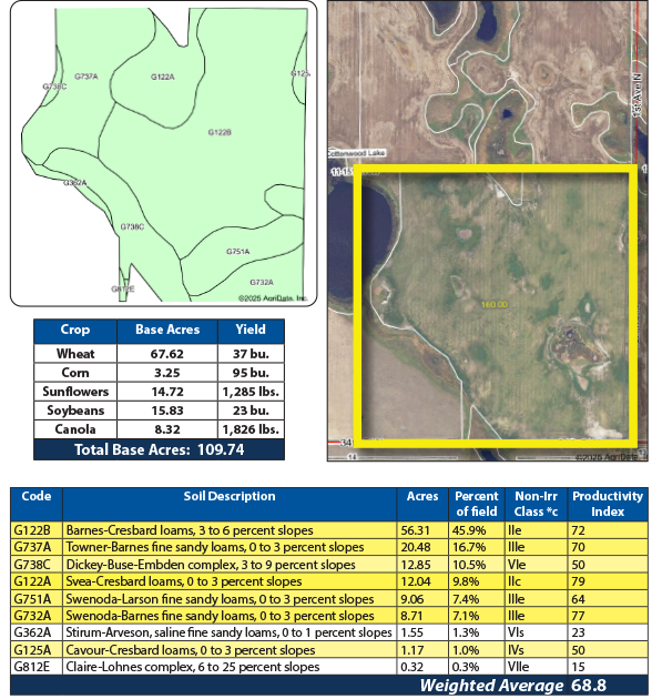 This productive cropland in Cottonwood Lake Township features nearly all Barnes Loam, Class II soils. The balance is hayland, grassland and wetlands with exceptional waterfowl and whitetail deer hunting. This farmland is available in 2025.