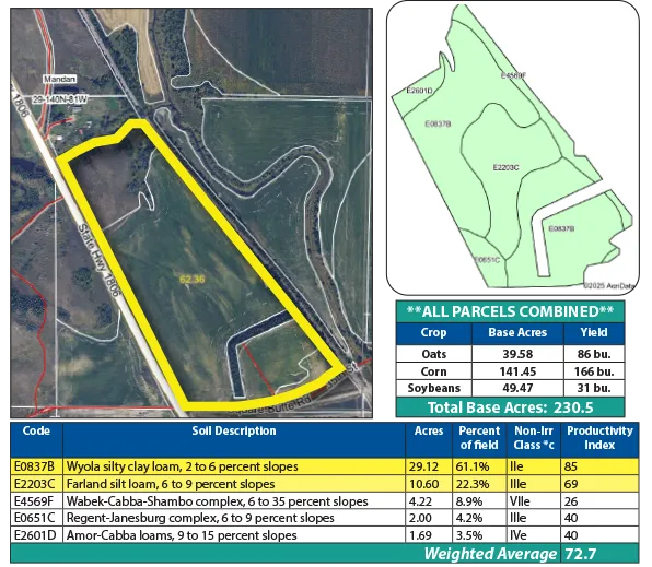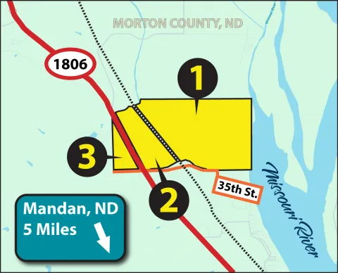 This is a rare opportunity to purchase a highly diverse and productive property just five miles north of Mandan, ND, along Hwy. #1806. Offered in three distinct parcels, this land presents strong potential for both agricultural and development uses. The cropland is highly productive, featuring irrigated acres primarily consisting of Lohler Complex soils, boasting Soil Productivity Indexes (SPI) over 76 — ideal for a wide variety of crops. The property also benefits from excellent logistical advantages, including BNSF Railway frontage and excellent access via 35th St. Parcel 3 stands out as prime development land with direct access off Hwy. #1806, making it an exceptional investment for residential properties. Whether you’re looking to expand your farming operation or capitalize on a high-potential development opportunity, this property deserves your attention.