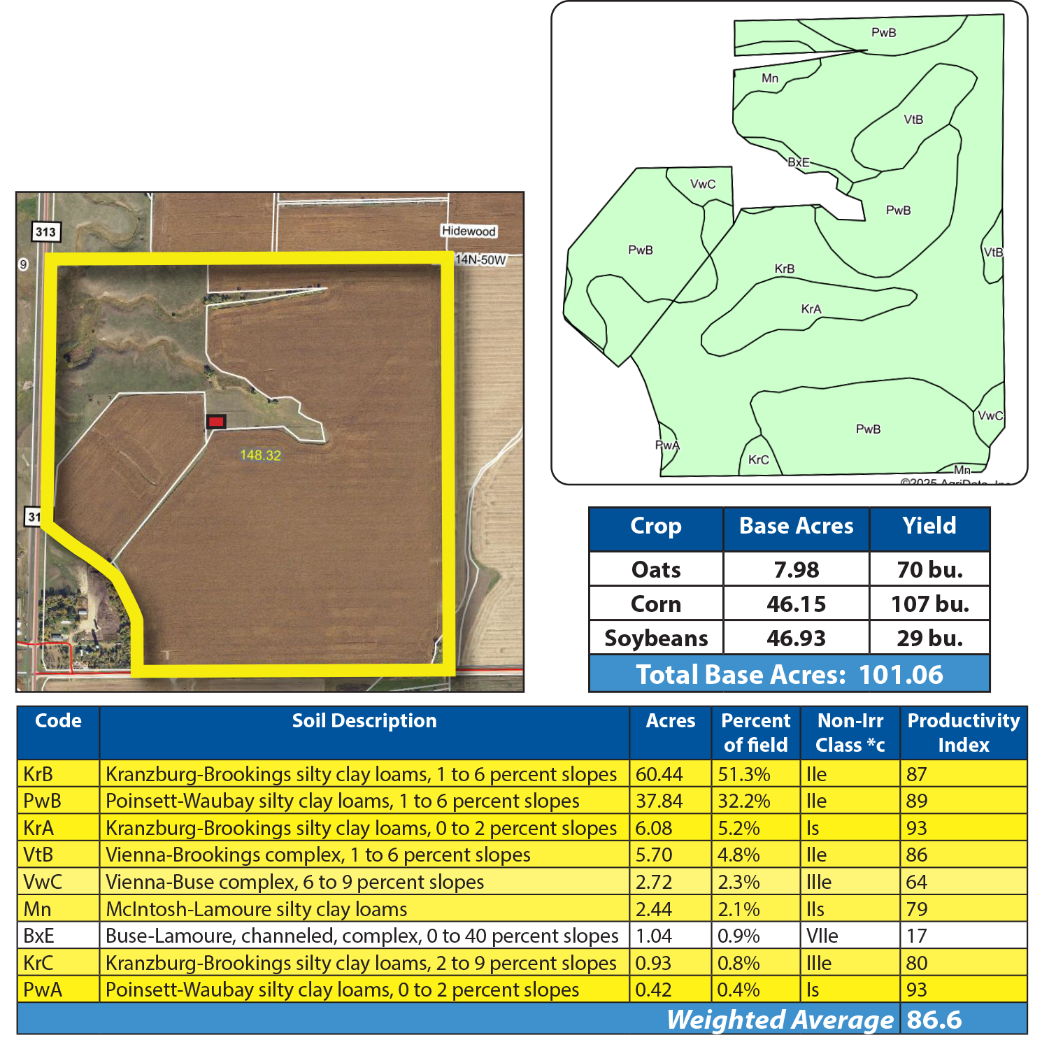 This parcel features excellent cropland with a Soil Productivity Index (SPI) of 86.6! The remaining balance features pastureland offering excellent grazing and hunting opportunities.