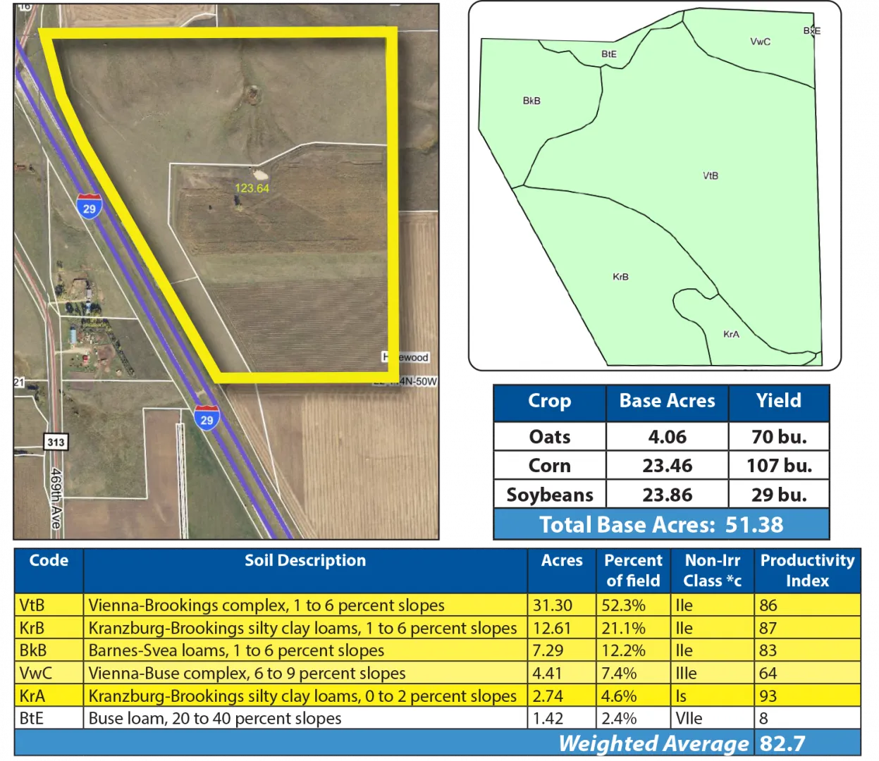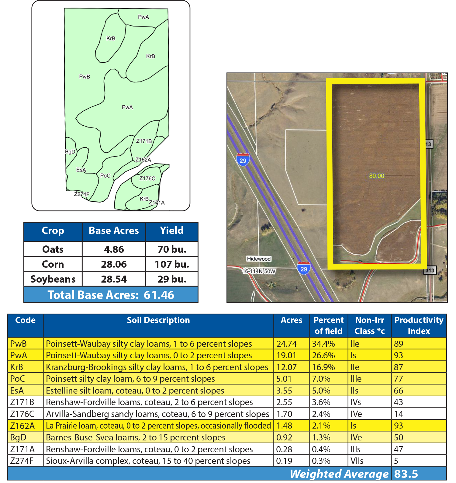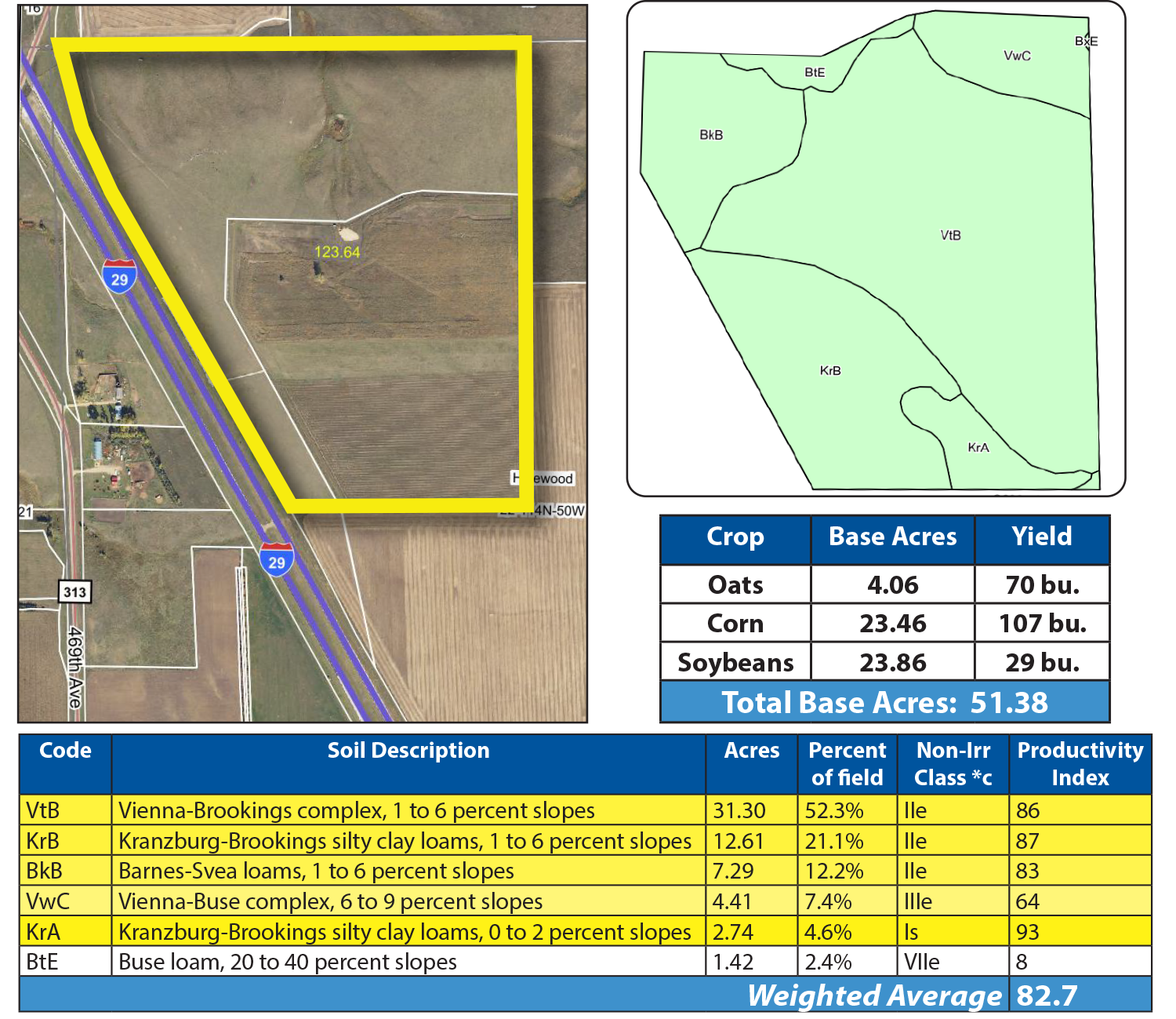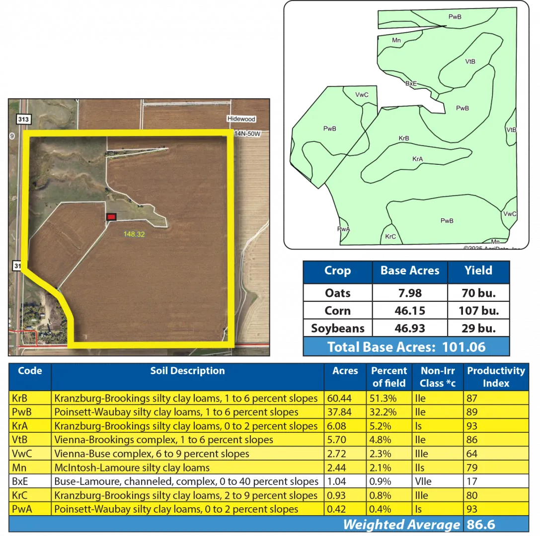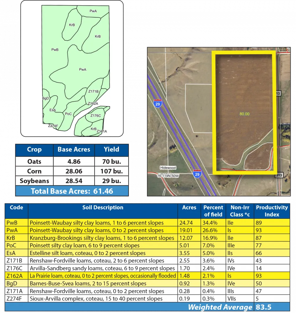 This parcel along I-29 features excellent cropland with an SPI of 82.7! The pastureland offers excellent grazing, water sources and hunting.