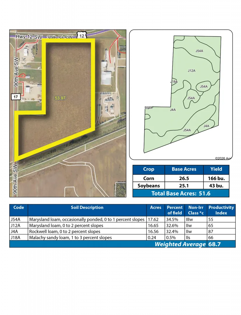 This is an excellent opportunity to purchase productive farmland located just outside of Danvers, MN, with Hwy. #12, County Rd. #17 frontage and RR frontage. This 53.97 +/- acre property features 51.62 +/- FSA crop acres and carries a Soil Productivity Index (SPI) of 68.7. The property is subject to an existing lease for the 2026 crop year with the buyer having full discretion to either continue leasing the property or farm it themselves beginning in 2027. The cropland consists primarily of productive Marysland and Rockwell loam soils making it a quality addition to any farming operation or land investment portfolio.