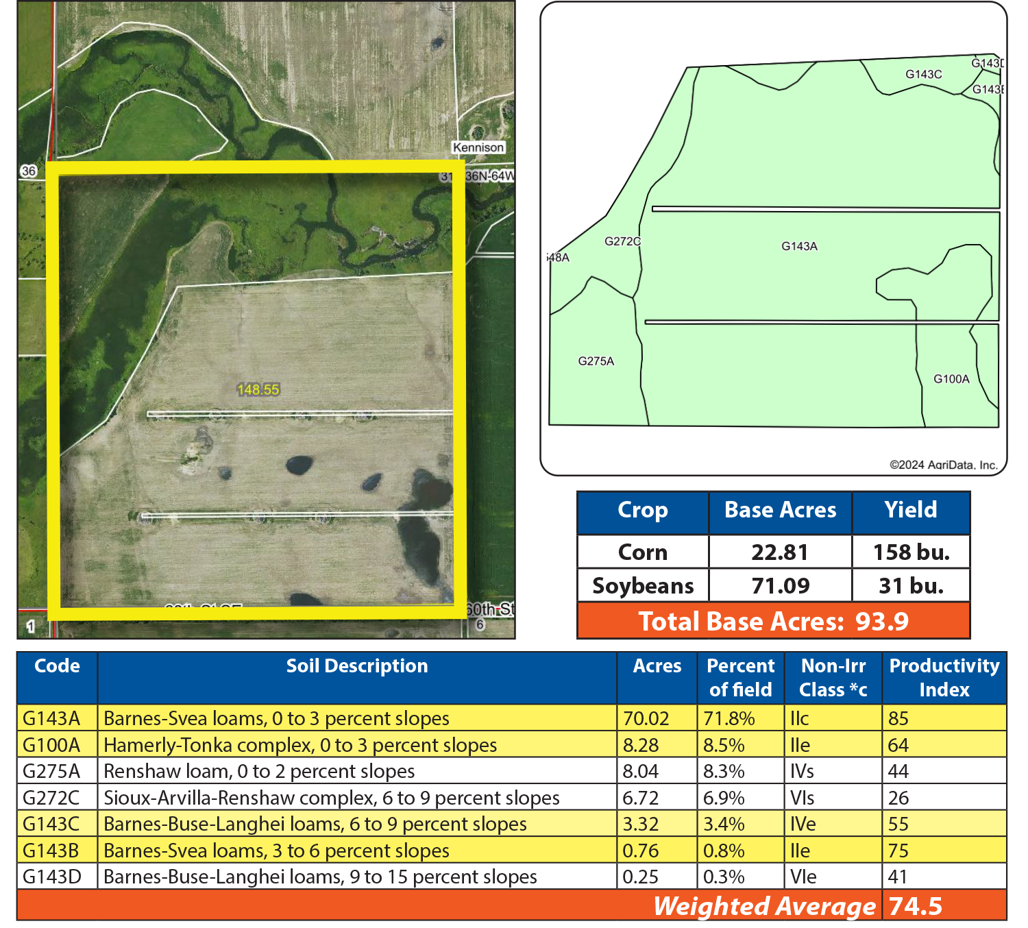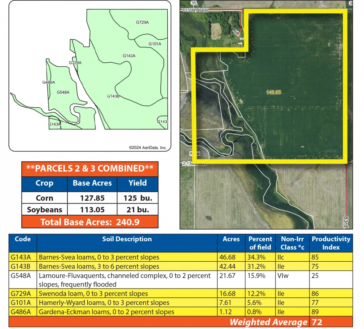 This 150.18 +/- acre parcel features 135.86 +/- productive crop acres with a weighted SPI of 71.7. Additionally, a proposed transmission line easement agreement offers financial incentives, including annual payments and one-time payments for linear footage, guy wires, and transmission poles, should the transmission line be constructed.