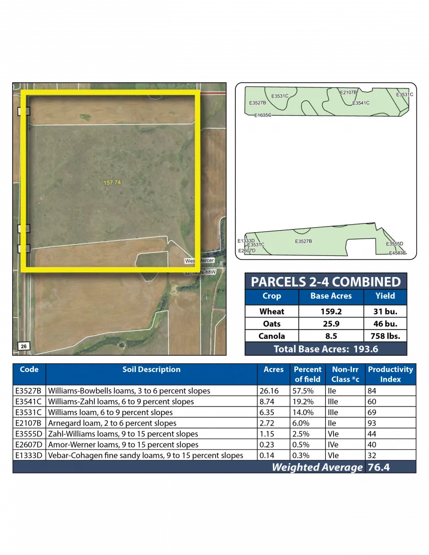 Parcel 1 boasts 97.14 +/- acres of productive cropland with an SPI of 79! The balance of the property consists of lush grasses and a water dugout for livestock.