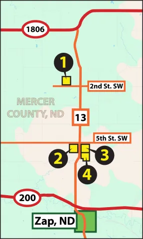 This Mercer County land offering features 616.03 +/- acres across four parcels near Zap, ND. The land features strong producing soils, mostly all with Soil Productivity Index (SPI) ratings in the 70s which are adequate for growing corn, soybeans, and small grains. The pastureland supports lush grasses, well-maintained fences, and excellent water sources. All four parcels have great access and are available for production in 2026. Whether you are a producer expanding your operation or an investor seeking quality farmland, this auction offers flexibility and opportunity. This is a live auction with internet bidding available.