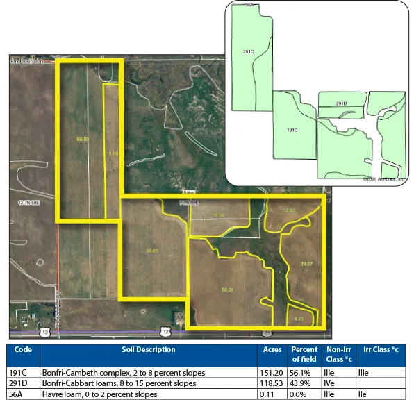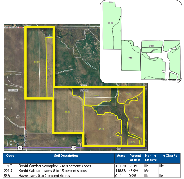 This property features approximately 196.75 +/- crop acres and 103.25 +/- mixed hayland/grassland acres. This unique property has excellent access off Hwy. #12 and also John Deere Ln. Excellent crop rotation with some hayland acres that can be converted to cropland with the approval of the landowner and Pifer’s Land Management.