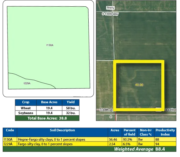 This exceptional 40 +/- acre property in Norman County, north of Shelly, Minnesota, presents a rare opportunity to acquire highly productive cropland. This 39 +/- acres of cropland is ideal for growing corn, sugar beets, wheat, sunflowers, and soybeans. Whether you're looking to expand your agricultural operations or diversify your investment portfolio, this property is an excellent choice! Available for the 2026 crop year and with excellent soil productivity index with an of 88 SPI, you don't want to miss this opportunity to secure prime agricultural land!