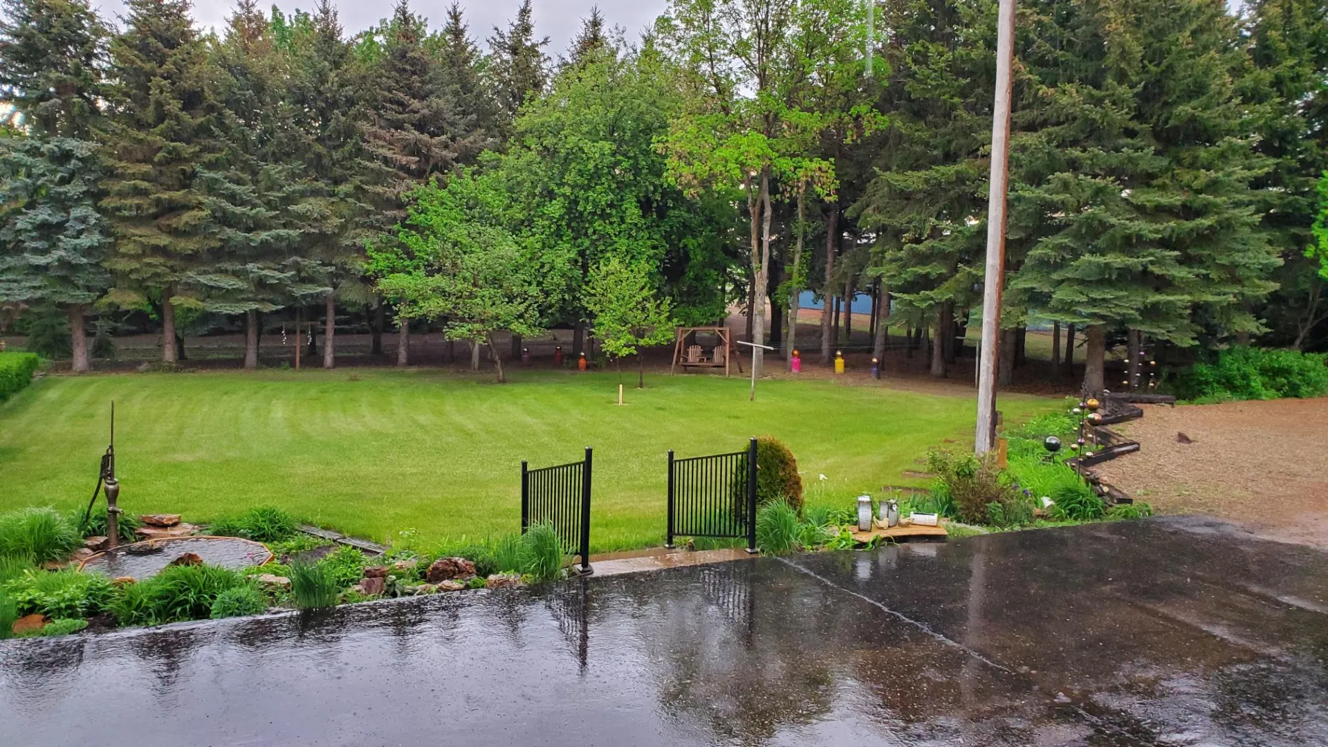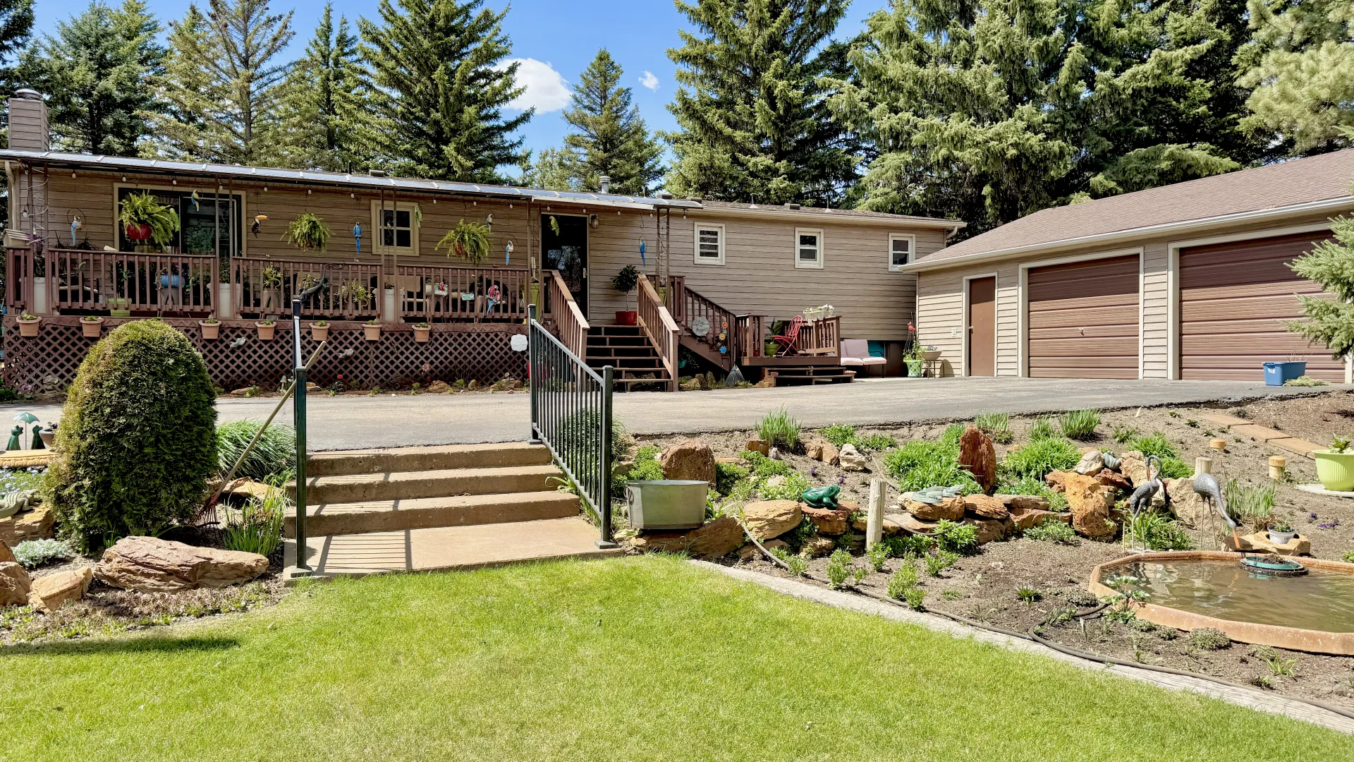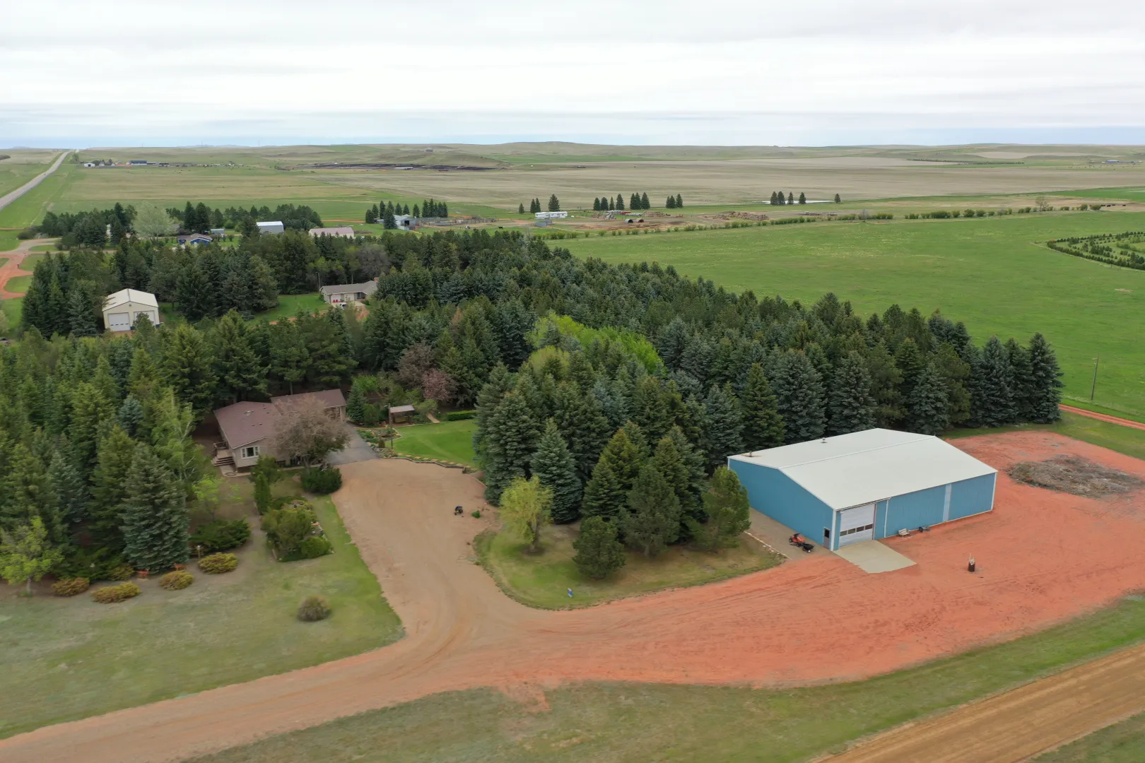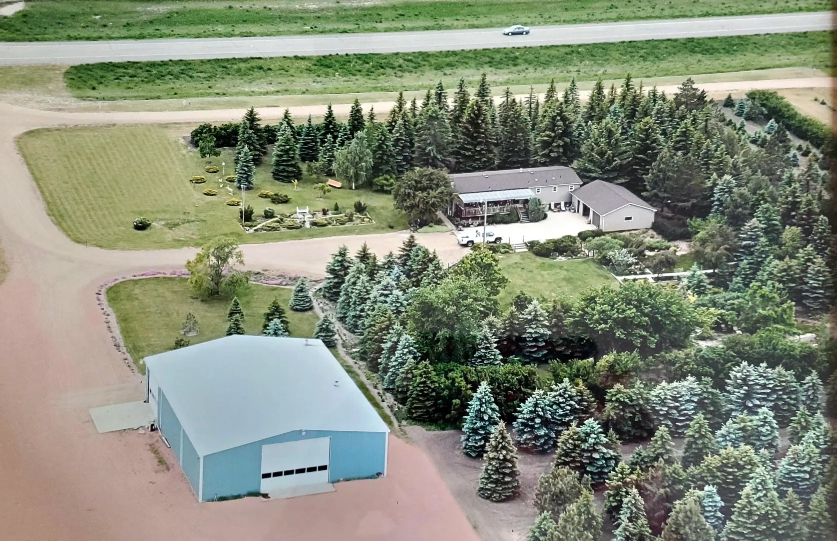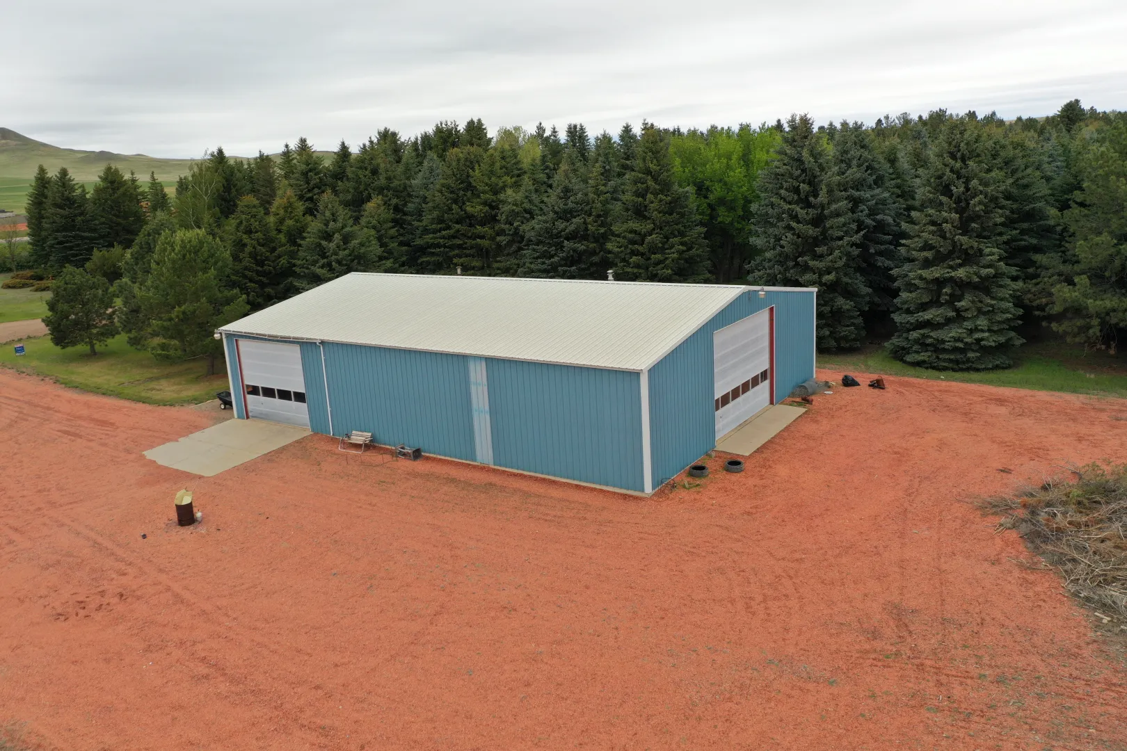 Located on over 6 picturesque acres just off Highway 85, this well-maintained property offers both residential comfort and commercial opportunity. The home is built on a solid poured concrete basement and features durable steel siding for lasting peace of mind. The oversized, insulated 2-stall garage includes a floor drain—perfect for year-round use.