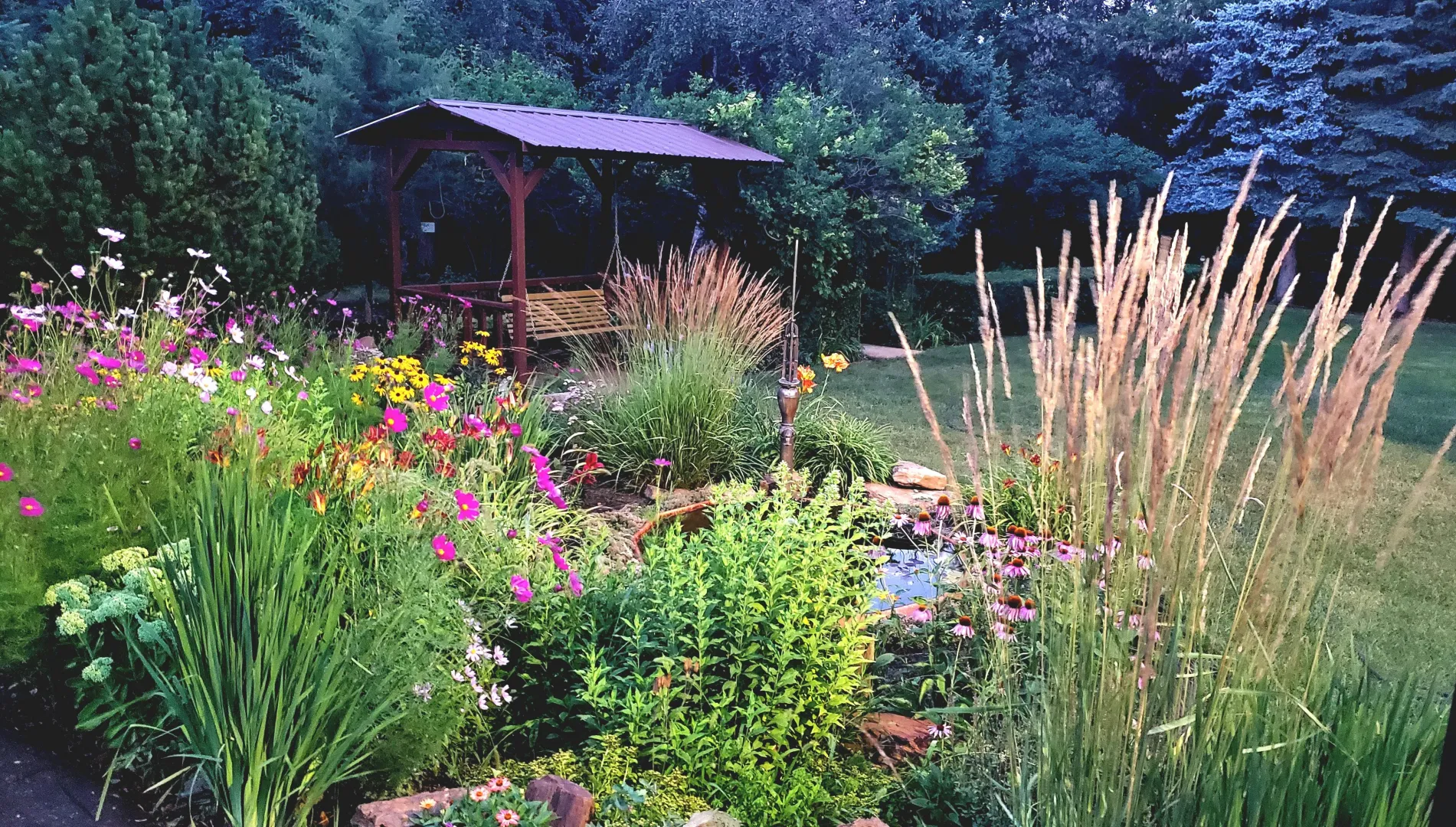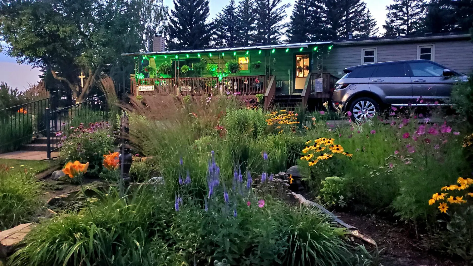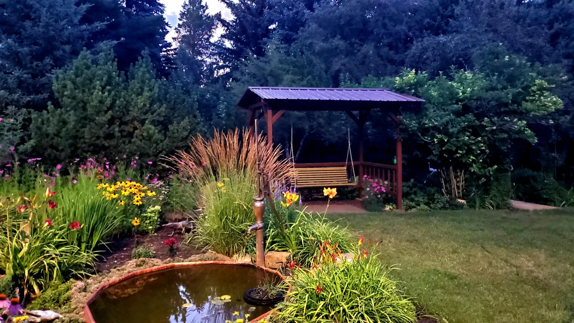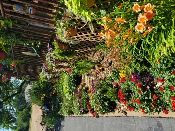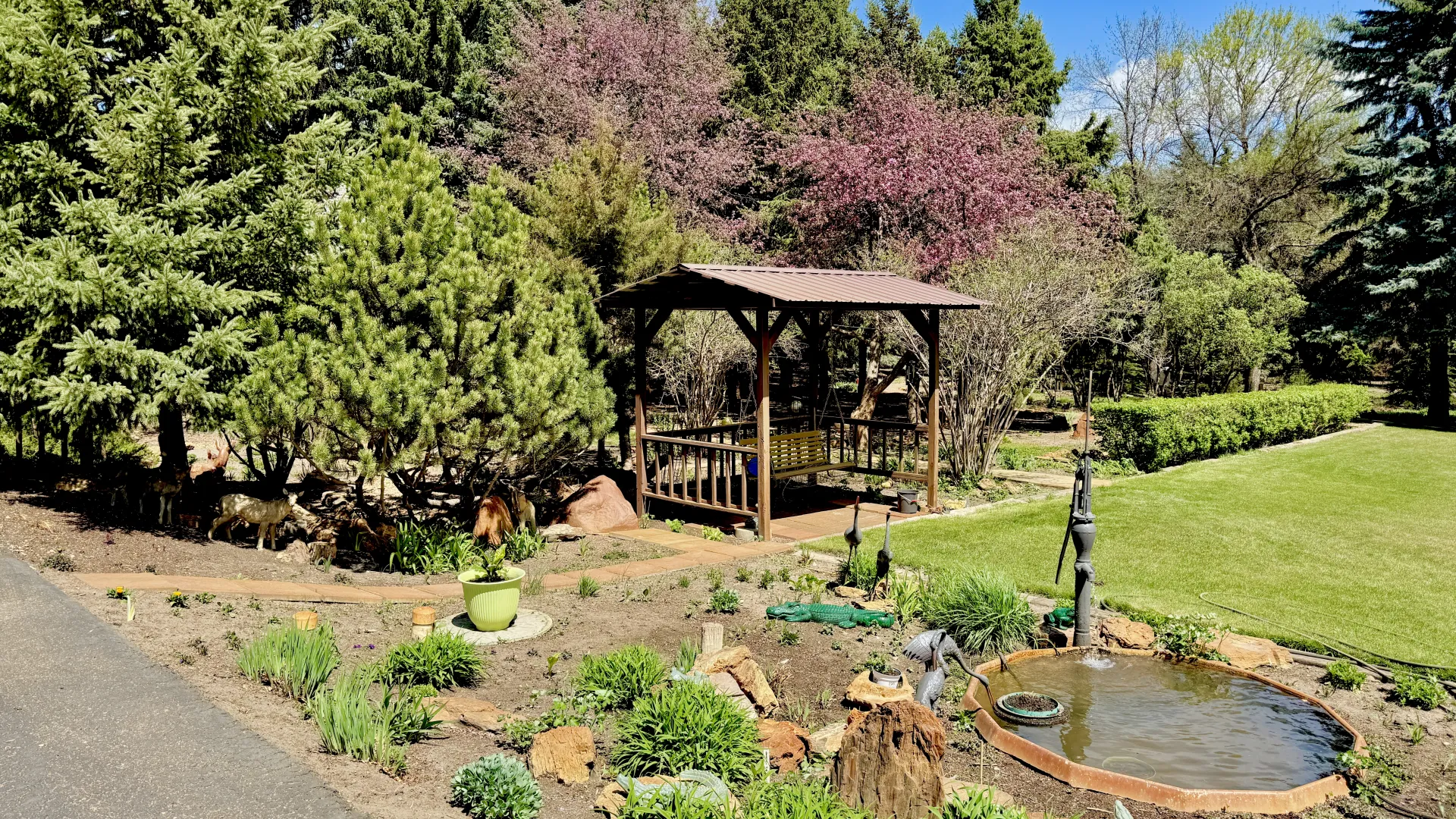 Beautiful mature trees, flower beds, and sidewalks throughout