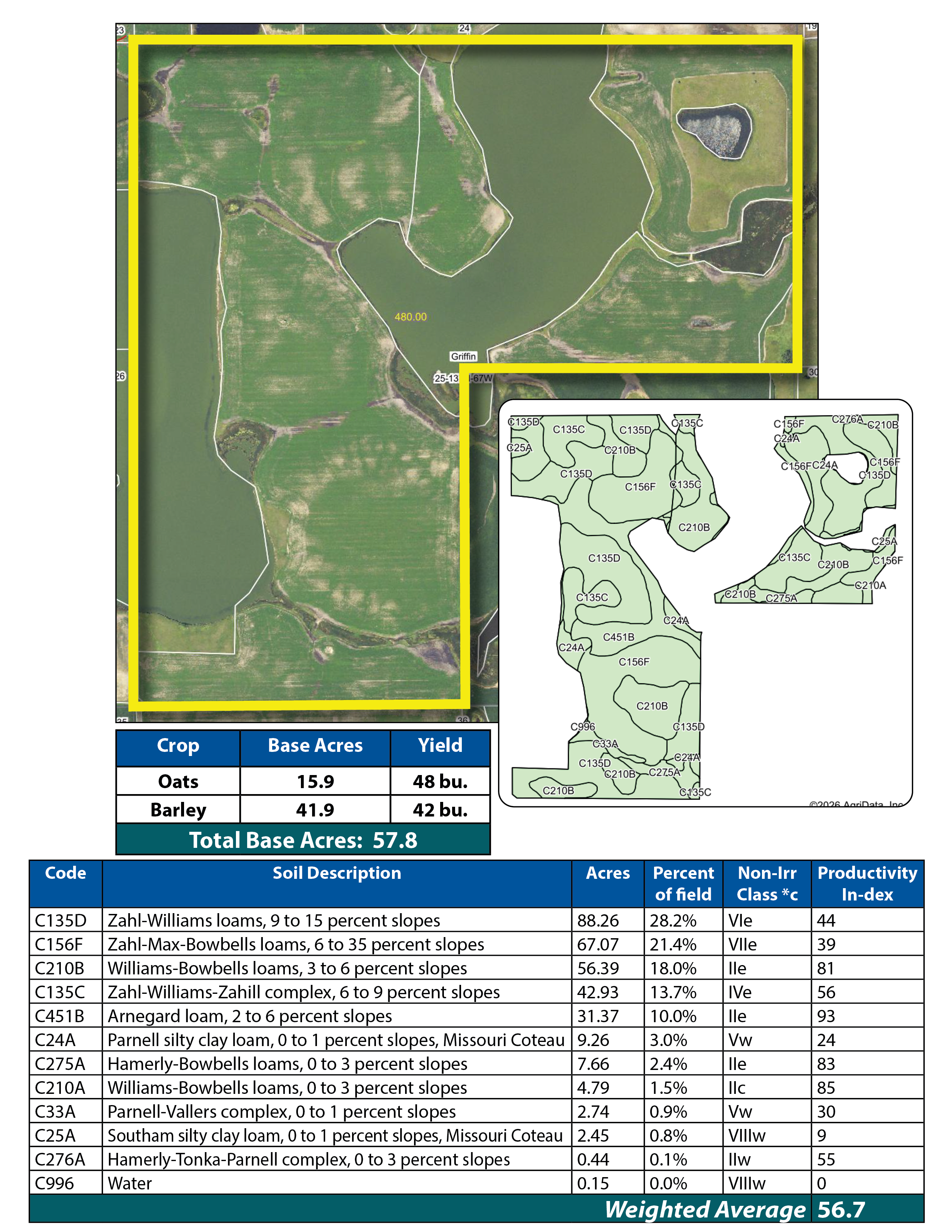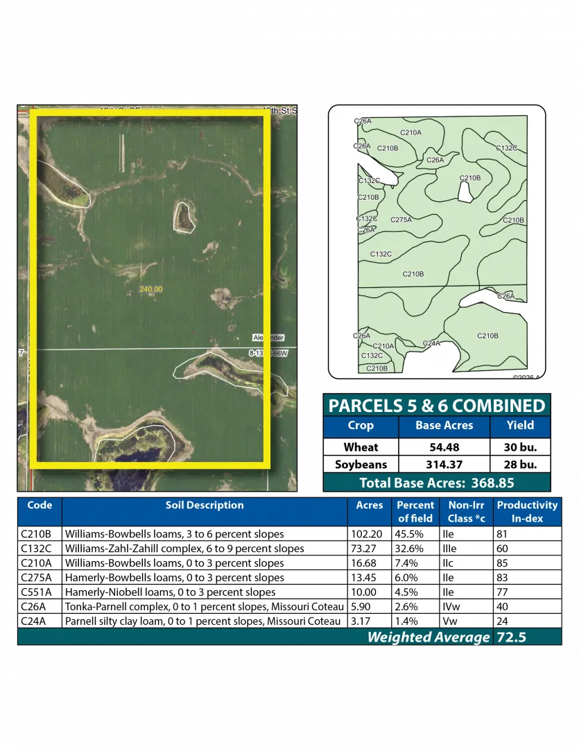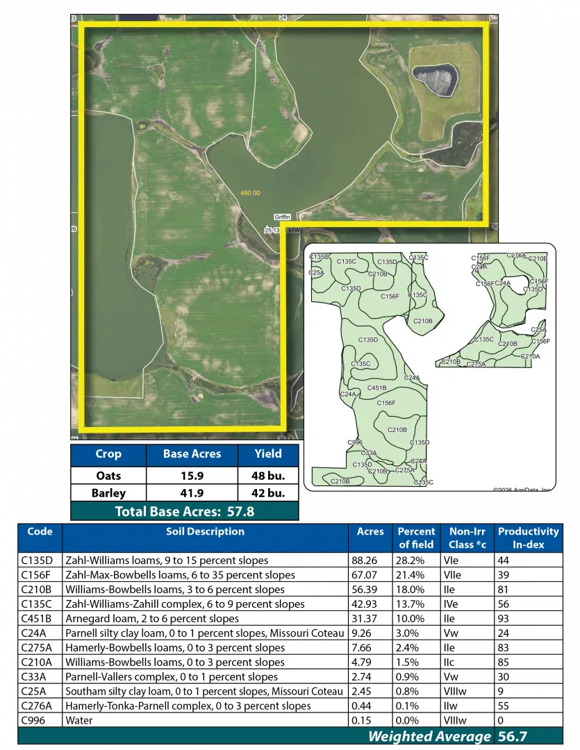 This exceptional land offering features 1,587.34 +/- acres made up of mostly all productive cropland across 7 parcels in Stutsman and Dickey Counties. These tracts offer strong cropping histories and highly productive soils, some with Soil Productivity Index (SPI) ratings in the 80s. Whether you are looking to expand your farming operation or seeking a solid investment, this land offers an unparalleled opportunity. This is a live auction with internet bidding available.