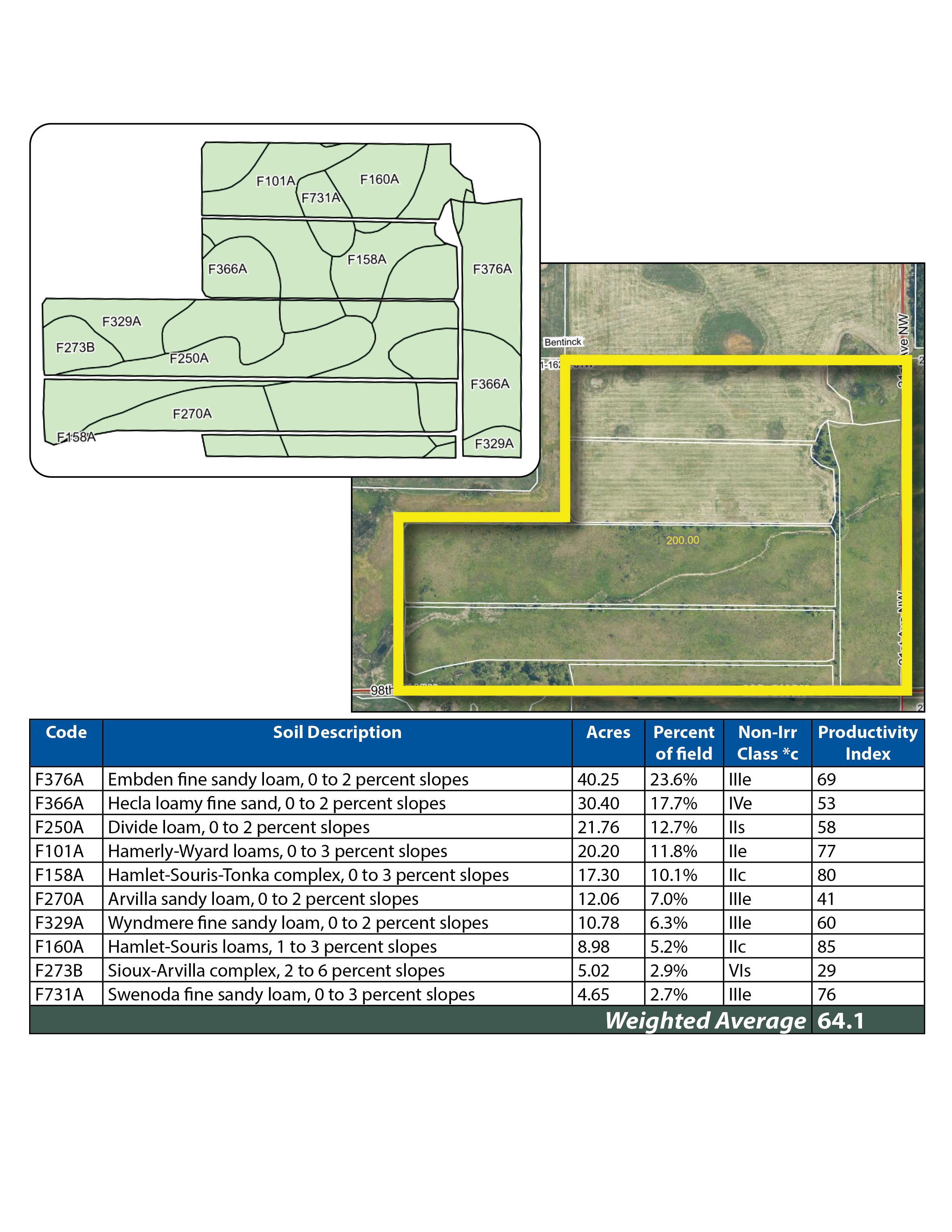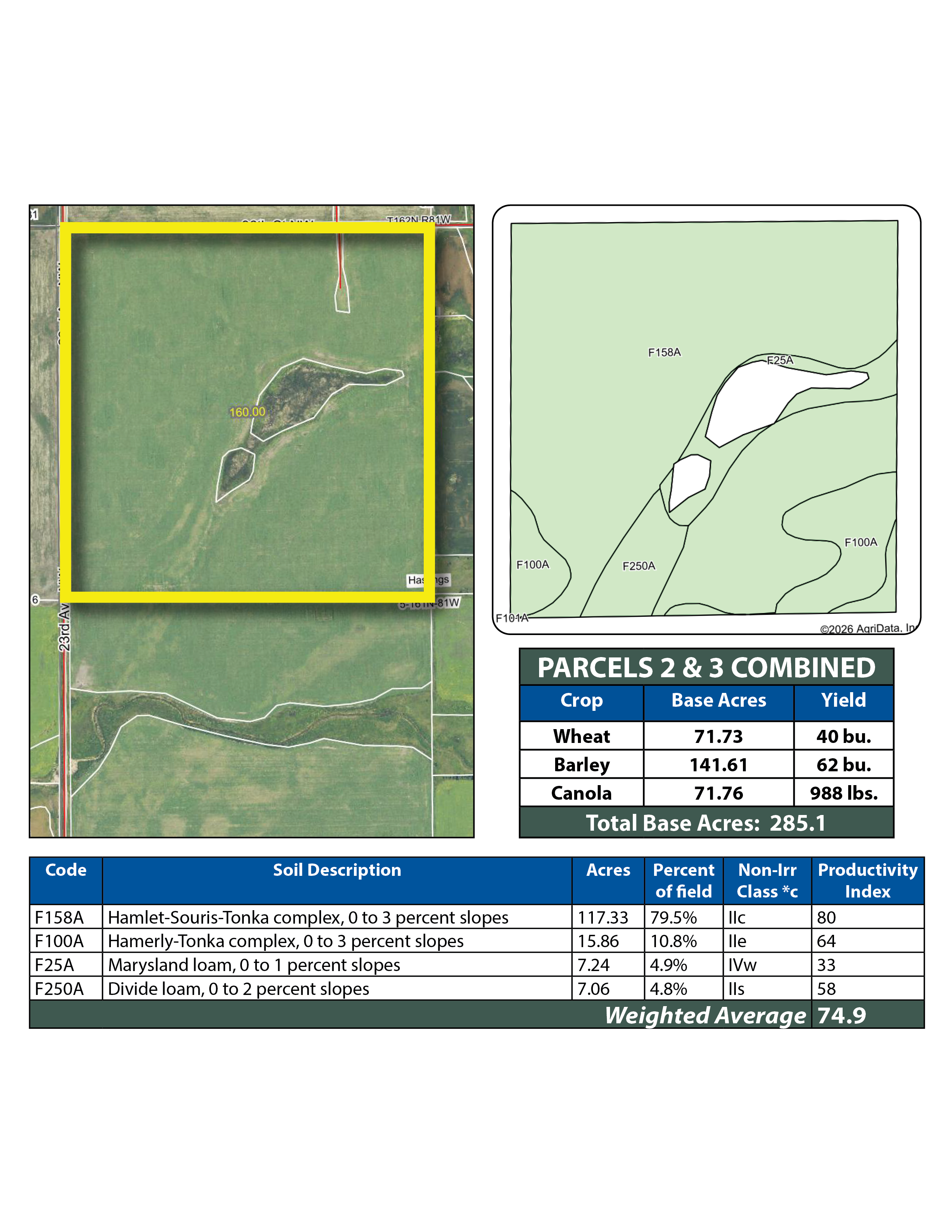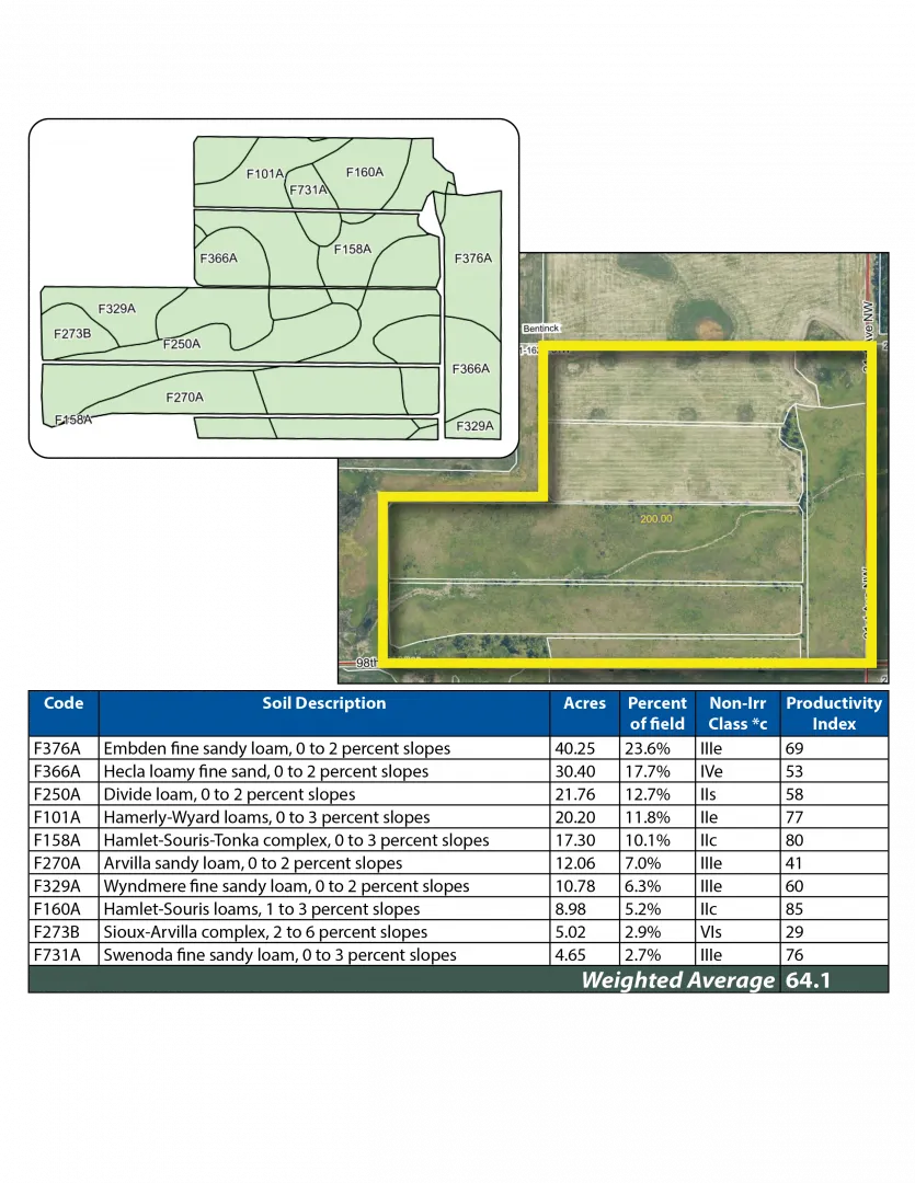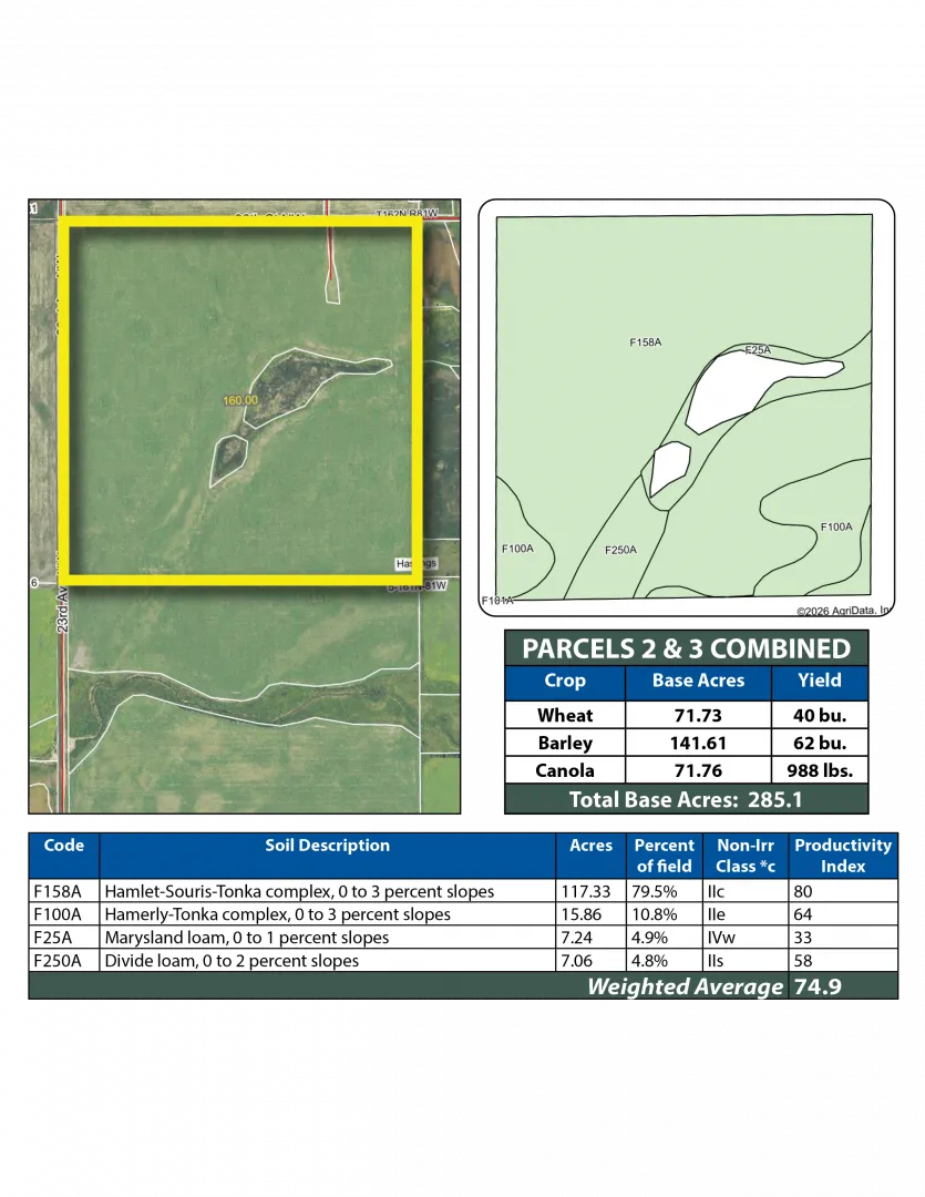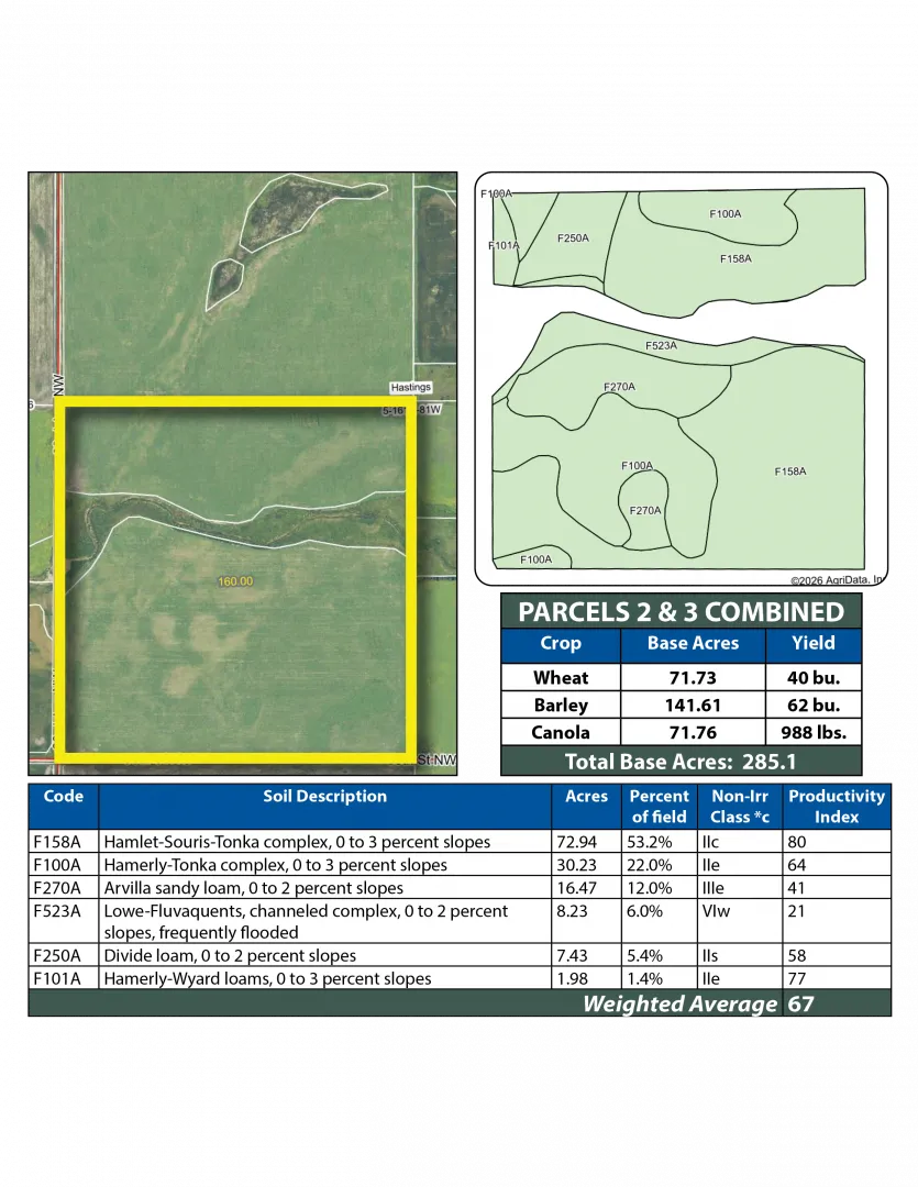 This parcel features highly productive cropland with over 117 +/- acres of Hamlet–Souris–Tonka complex soils that have an SPI of 80. Excellent access off 23rd Ave. NW.